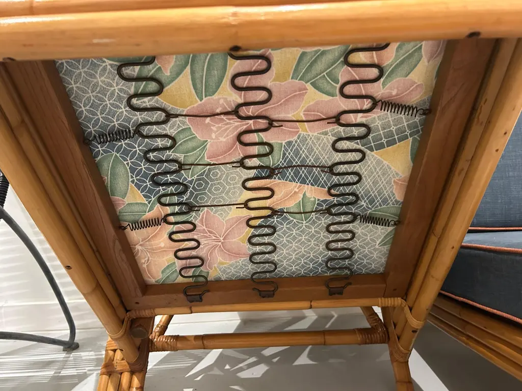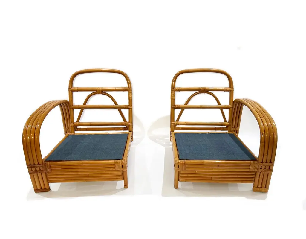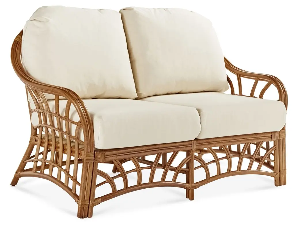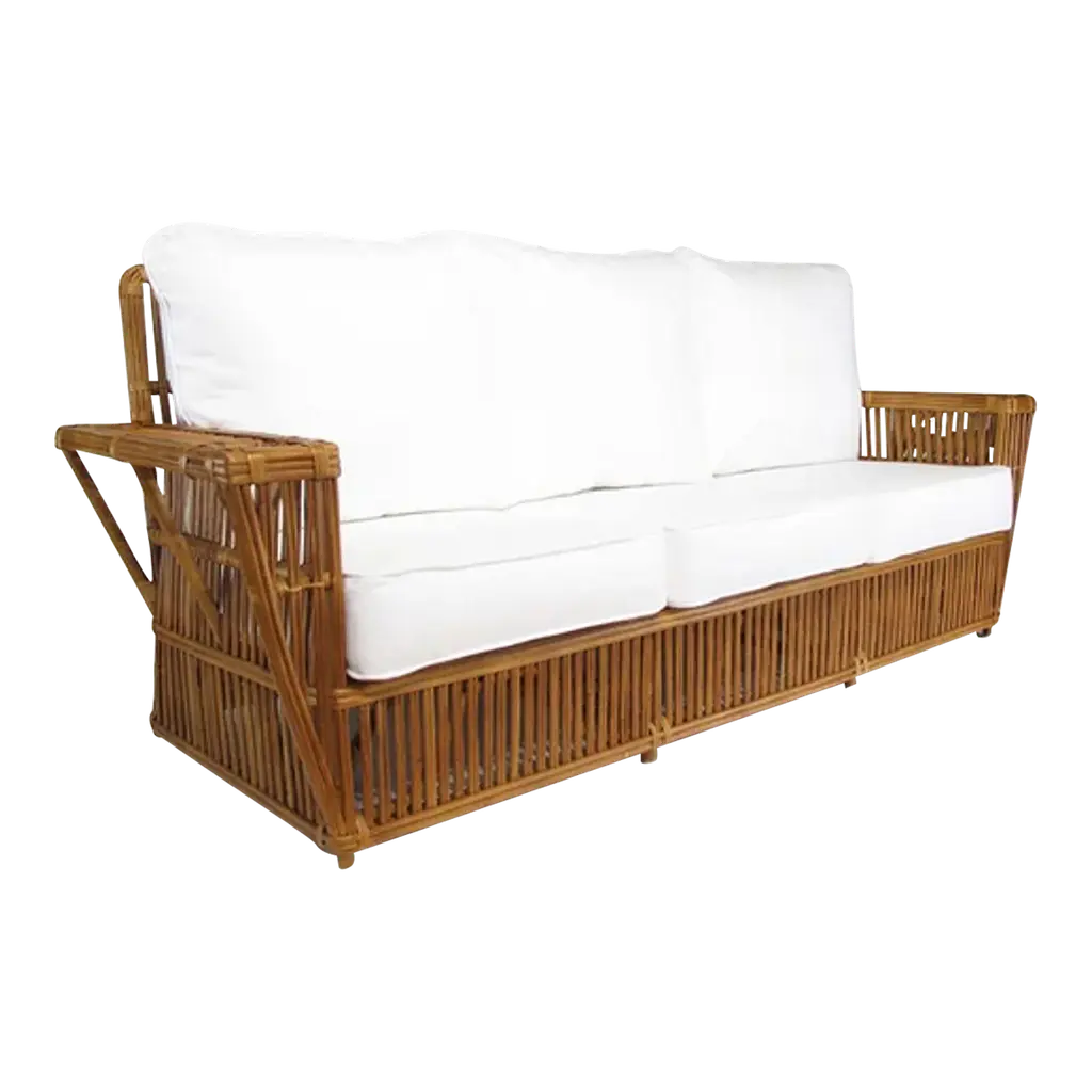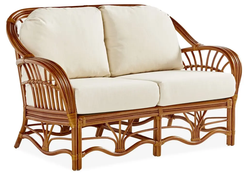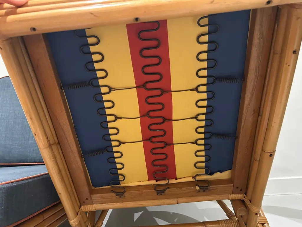 Two-seater modular rattan sofa with blue fabric cushions and seat base coverings. The four loose cushions are 4 3/8" thick, have red welting and are zippered. The frames were refinished in 2022 are in great condition.Arm height: 20 7/8"Seat depth: 21 7/8"