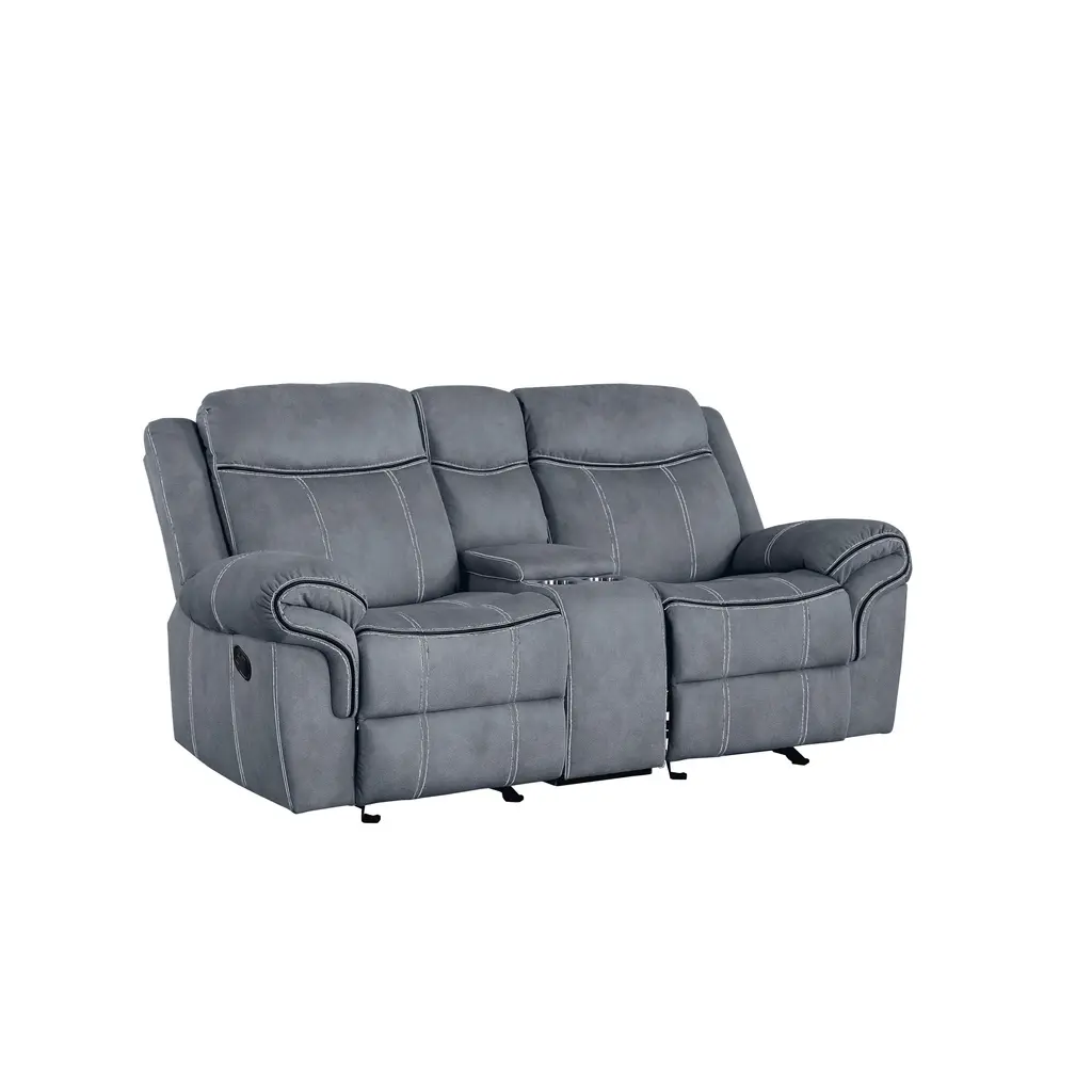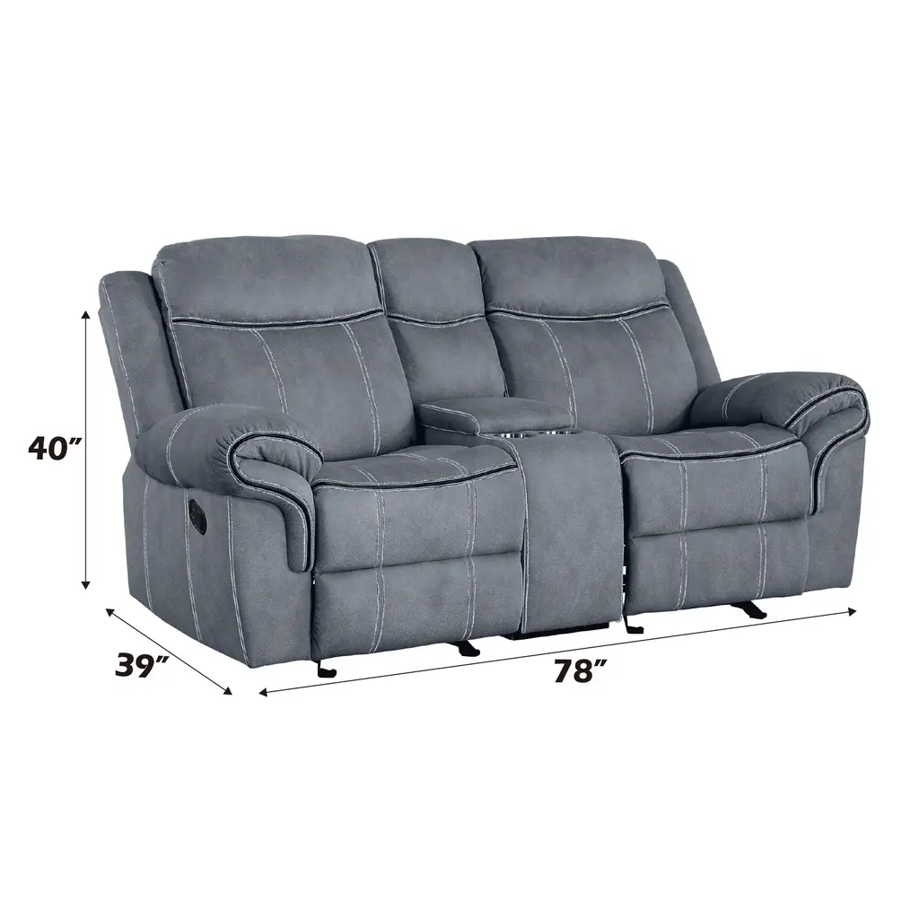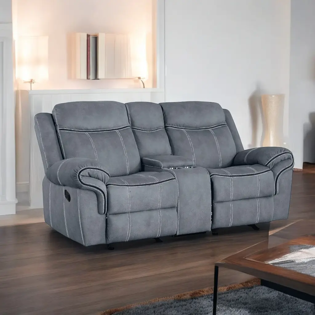 ▷This motion loveseat, draped in a sumptuous two-tone gray velvet, brings together luxurious comfort and versatile functionality. ▷The glider and motion reclining mechanisms, operated by an external latch pull handle, offer a smooth and relaxing experience. ▷Its tight back and seat cushions, crafted with pocket coil construction and supported by a durable wood and metal frame, ensure lasting comfort and support. ▷The central console provides a thoughtful touch of practicality, featuring built-in cup holders, a USB charging dock, and a spacious storage compartment for added convenience. ▷Horizontal tufted accents and plush pillow-top armrests complete the design, making this loveseat a stylish and functional centerpiece for any living space. ▷Clearance from Wall: 3-Inches