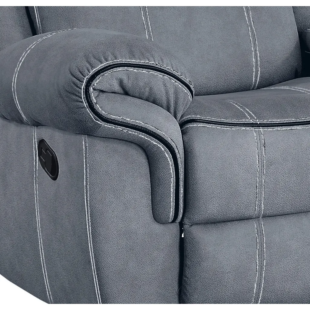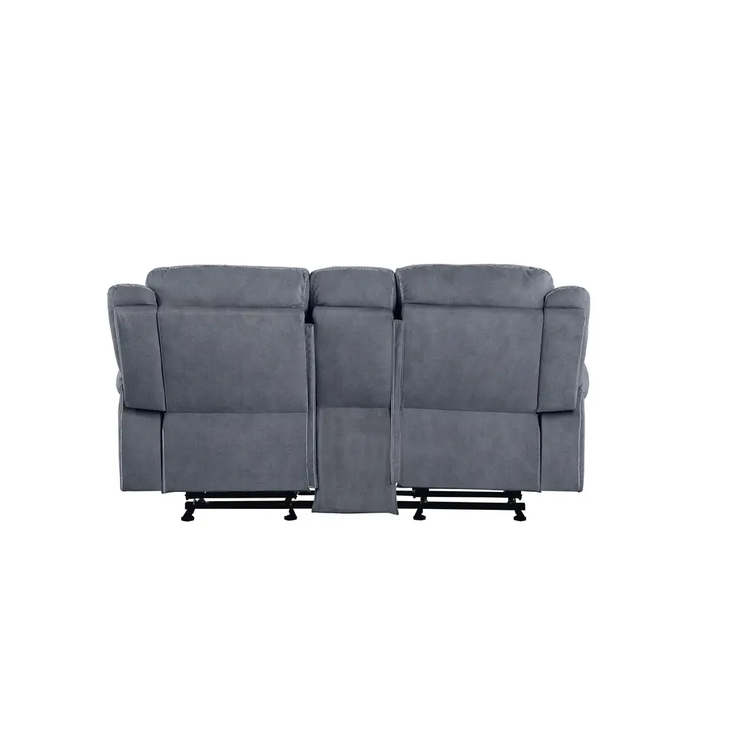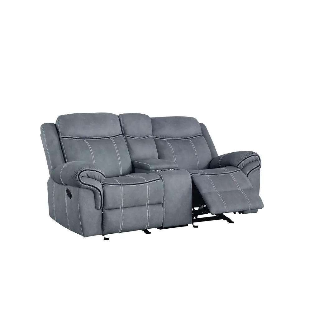 ▷This motion loveseat, draped in a sumptuous two-tone gray velvet, brings together luxurious comfort and versatile functionality. ▷The glider and motion reclining mechanisms, operated by an external latch pull handle, offer a smooth and relaxing experience. ▷Its tight back and seat cushions, crafted with pocket coil construction and supported by a durable wood and metal frame, ensure lasting comfort and support. ▷The central console provides a thoughtful touch of practicality, featuring built-in cup holders, a USB charging dock, and a spacious storage compartment for added convenience. ▷Horizontal tufted accents and plush pillow-top armrests complete the design, making this loveseat a stylish and functional centerpiece for any living space. ▷Clearance from Wall: 3-Inches