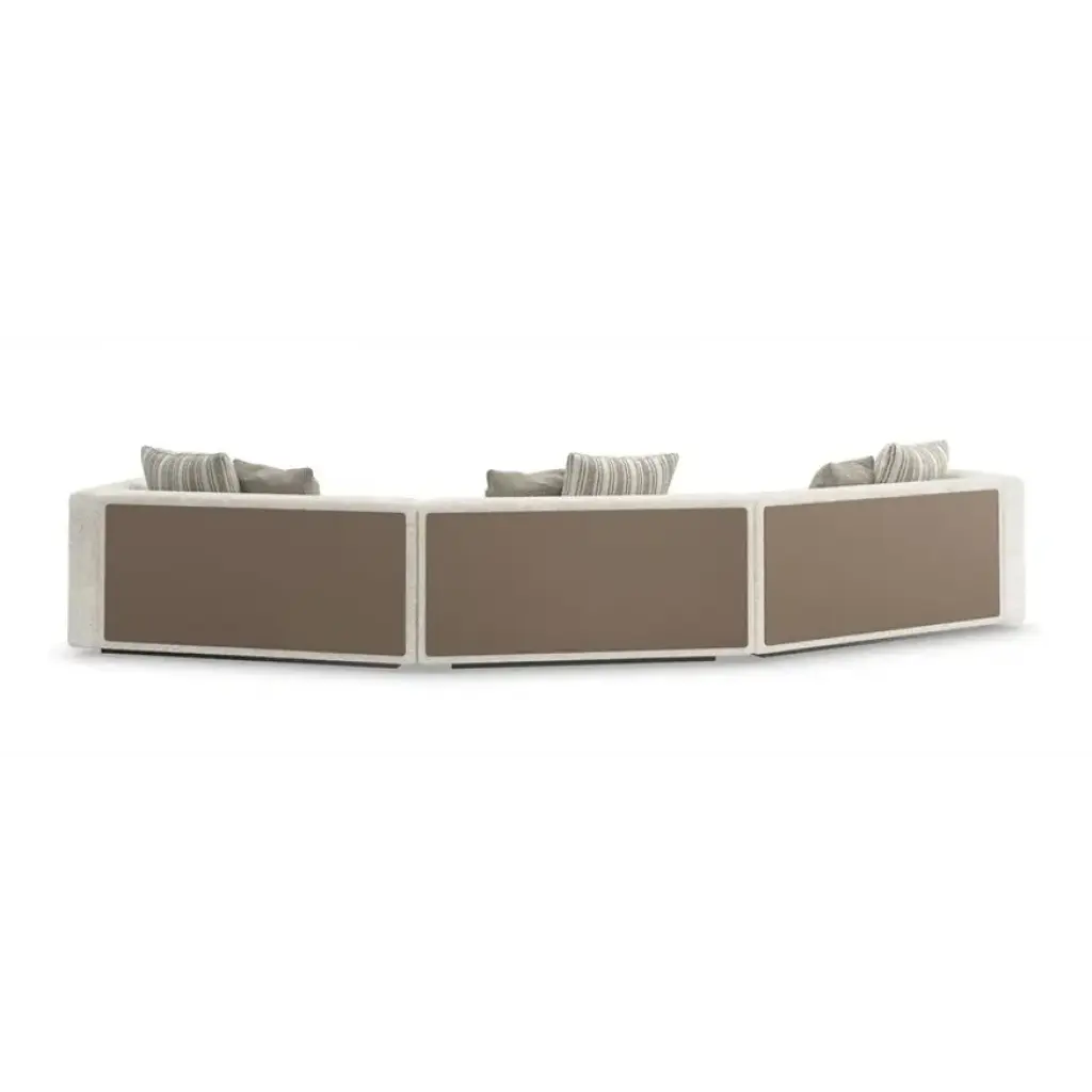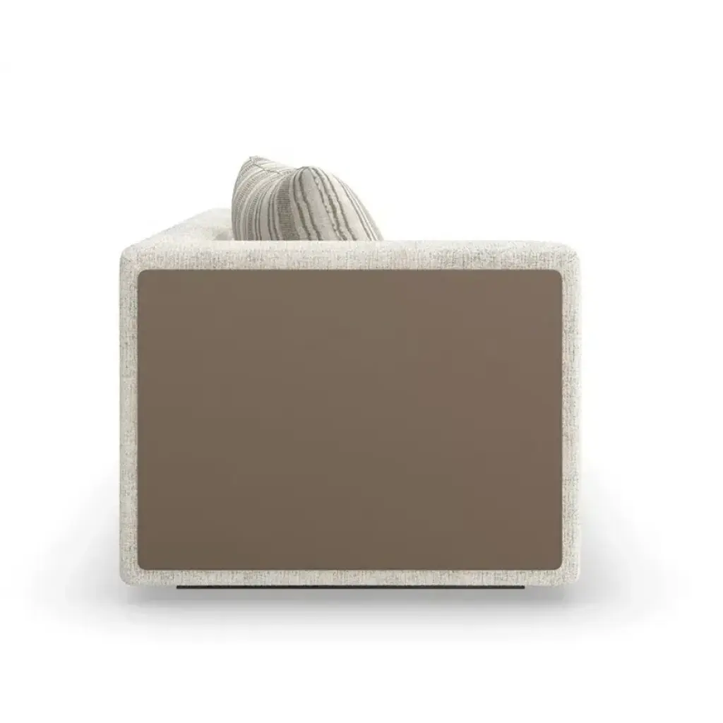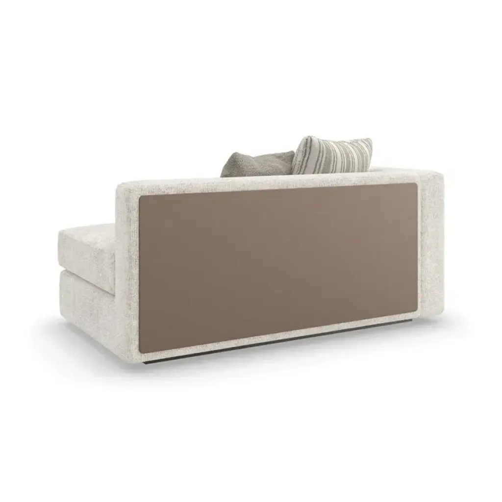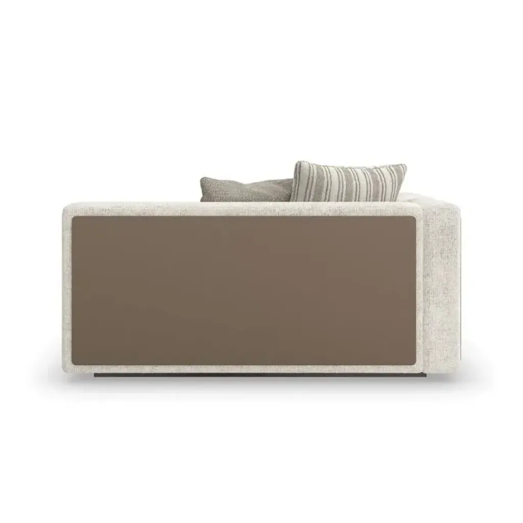 A holistic expression of design integrity, the Unity sectional mixes singular elements: organic tones, contrast, and texture to create a sense of harmony. Clean lines call to mind a modern European style, dressed in a creamy tactile fabric with a contrasting leather panel outback. Introduces a low, lounge-like aesthetic with lumbar cushioning along the back and feather-down toss pillows for added comfort and layering.