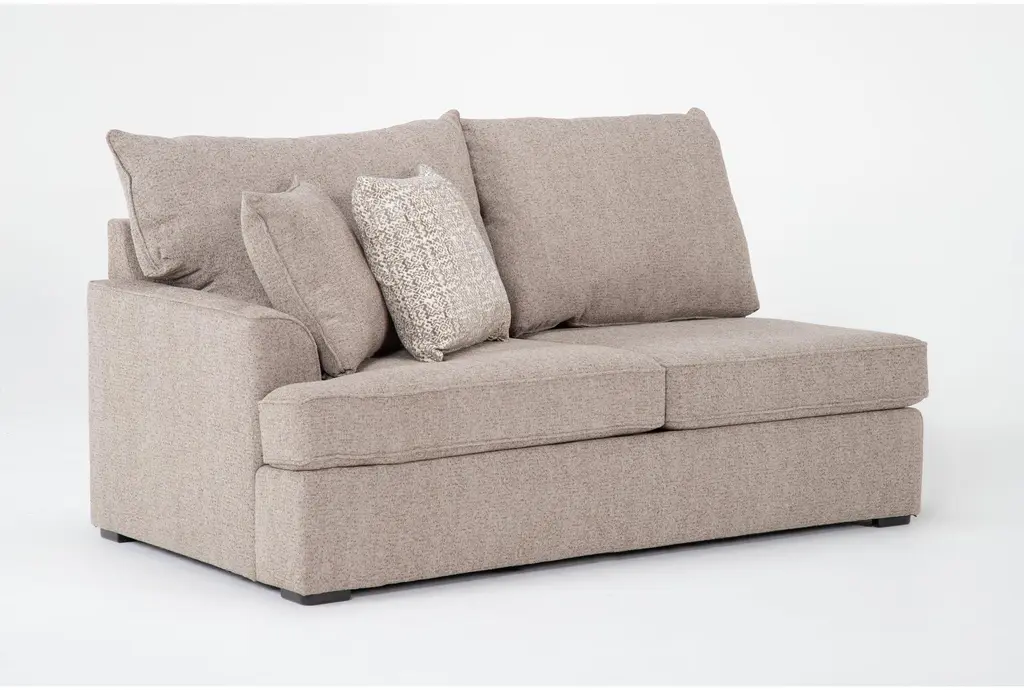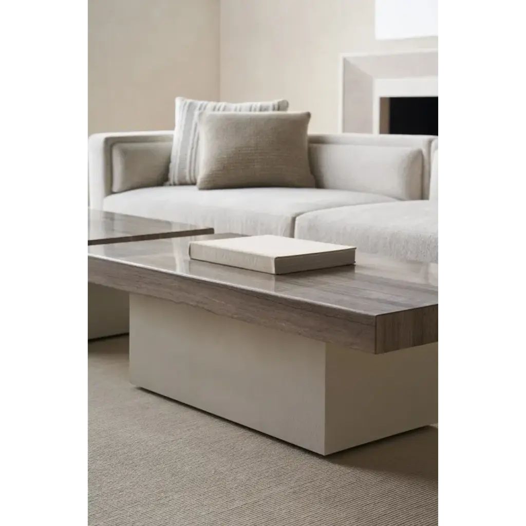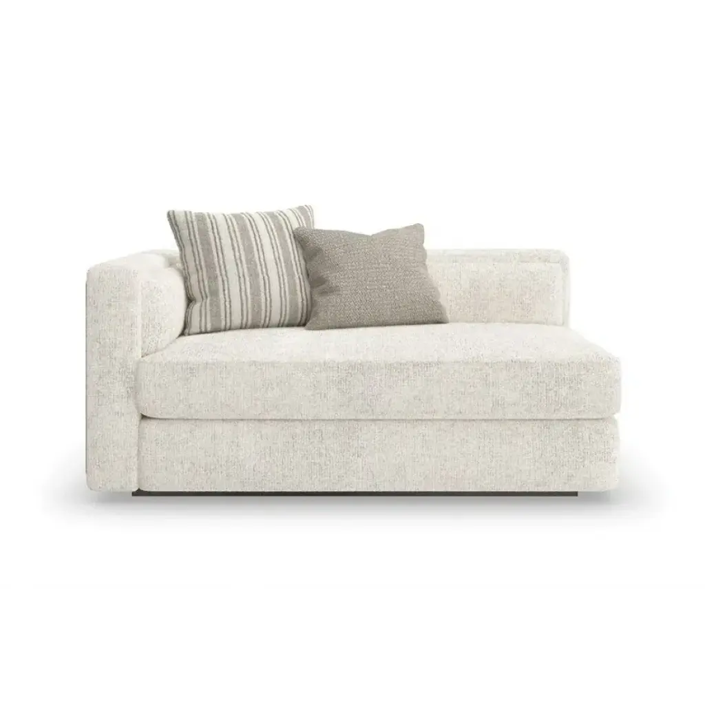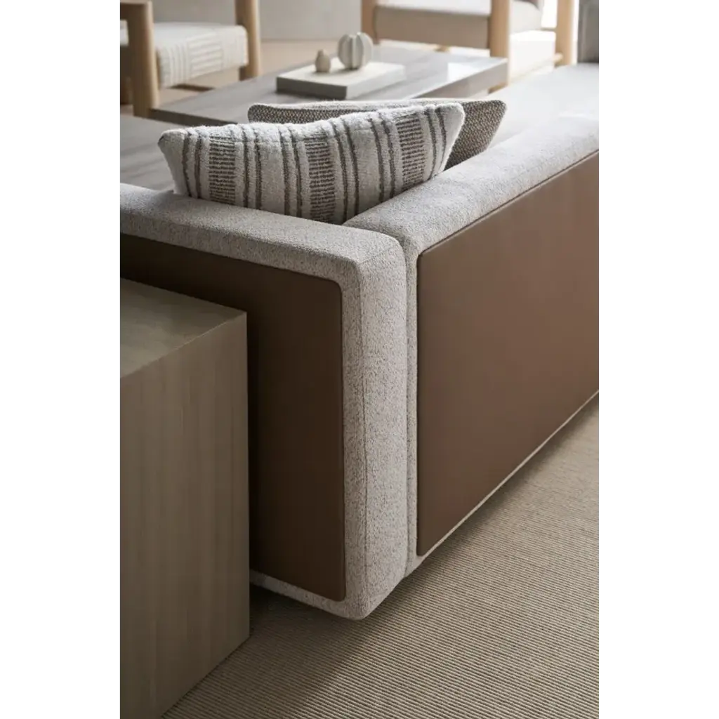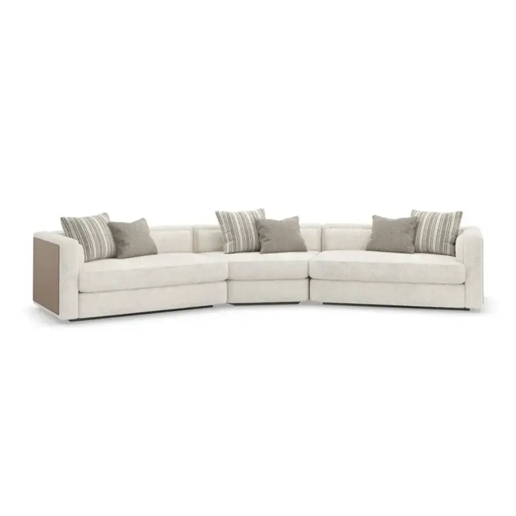 A holistic expression of design integrity, the Unity sectional mixes singular elements: organic tones, contrast, and texture to create a sense of harmony. Clean lines call to mind a modern European style, dressed in a creamy tactile fabric with a contrasting leather panel outback. Introduces a low, lounge-like aesthetic with lumbar cushioning along the back and feather-down toss pillows for added comfort and layering.