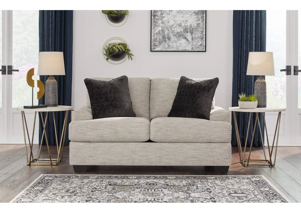Laid-back luxury meets neutral practicality in the Vayda loveseat. Taking its cues from contemporary design, this clean-lined piece is outfitted with angular arms for a layer of geometric expression. Softly upholstered, sizable cushions keep you comfortable, while black faux fur accent pillows bring a touch of soft glam. With this loveseat, winning style and superb functionality go hand in hand. Weight 109.000 lbs. (49.05kgs.)