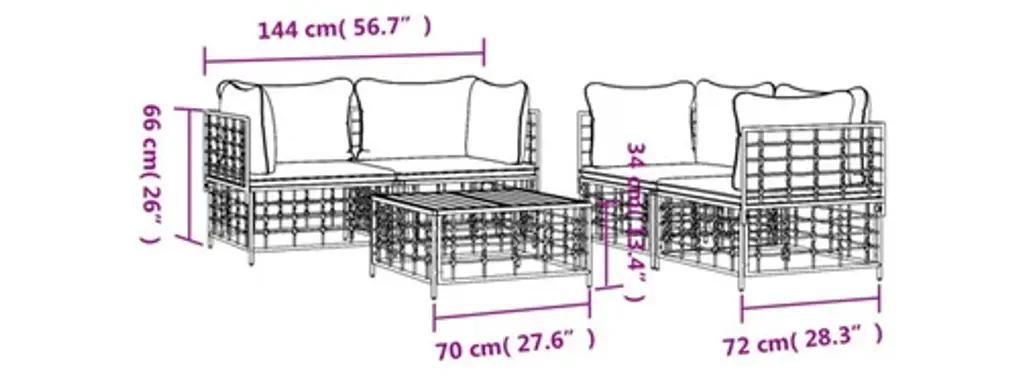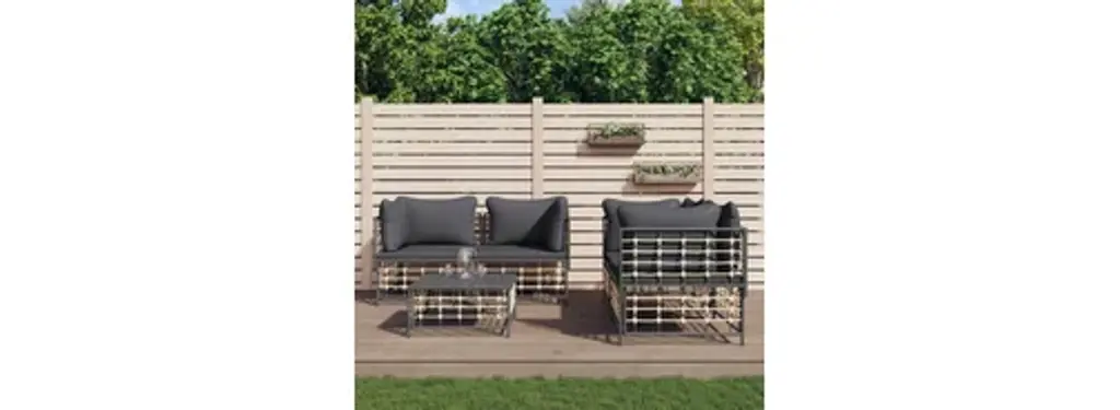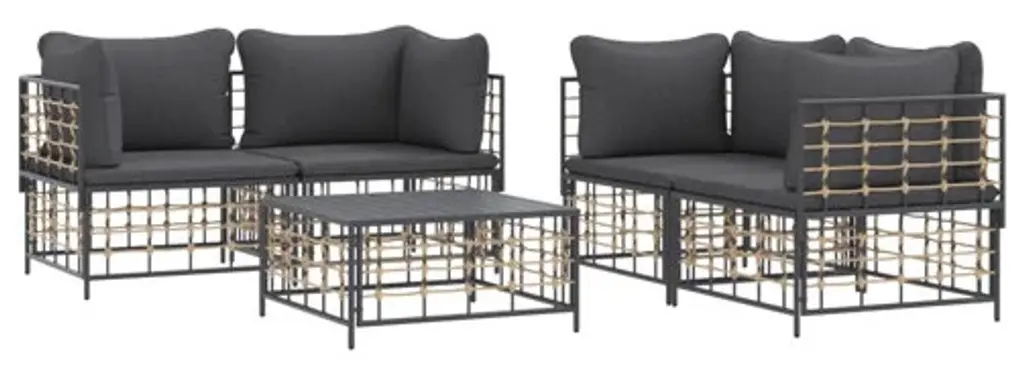 Enjoy a cozy coffee time in your outdoor space with this garden lounge set! It is a perfect addition to your garden and terrace, creating a lasting impression!Weather-resistant material: Poly rattan is weather resistant and easy to clean. It remains beautiful on the outside for a long period of time. It's more economical than other materials, while offering great quality, convenience and an aesthetic look.Sturdy and stable frame: The steel frame of the lounge set ensures sturdiness and stability.Comfortable seat experience: The backrest adds extra seating comfort for the lounge set. Also, the thickly padded cushions provide comfort for your sitting time.Sturdy tabletop: The sturdy tabletop of the coffee table is perfect for placing meals, drinks, vases, fruit bowls, or other decorative items.Modular design: The garden furniture set is flexible and easy to move around, so you can combine it with other modular segments in the webshop to create your own personal garden lounge set configurations!Note:To make sure your outdoor furniture stays beautiful, we recommend protecting it with a waterproof cover.Corner sofa:Color: AnthraciteMaterial: Poly rattan, powder-coated steel, textileneDimensions: 28.3" x 28.3" x 26" (W x D x H)Seat width: 27.6"Seat depth: 27.6"Max. load capacity: 242.5 lbTable:Color: AnthraciteMaterial: Poly rattan, powder-coated steelDimensions: 27.6" x 27.6" x 13.4" (W x D x H)Max. load capacity: 242.5 lbCushion:Cushion color: Dark grayMaterial: Fabric (100% polyester)Seat cushion filling material: FoamBack cushion filling material: PP cottonSeat cushion dimensions: 27.6" x 27.6" x 2" (W x D x T)Back cushion size: 27.2" x 16.1" (L x W) / 21.3" x 16.1" (L x W)Assembly required: YesDelivery contains:4 x Corner sofa4 x Seat cushion8 x Back cushion1 x Table
