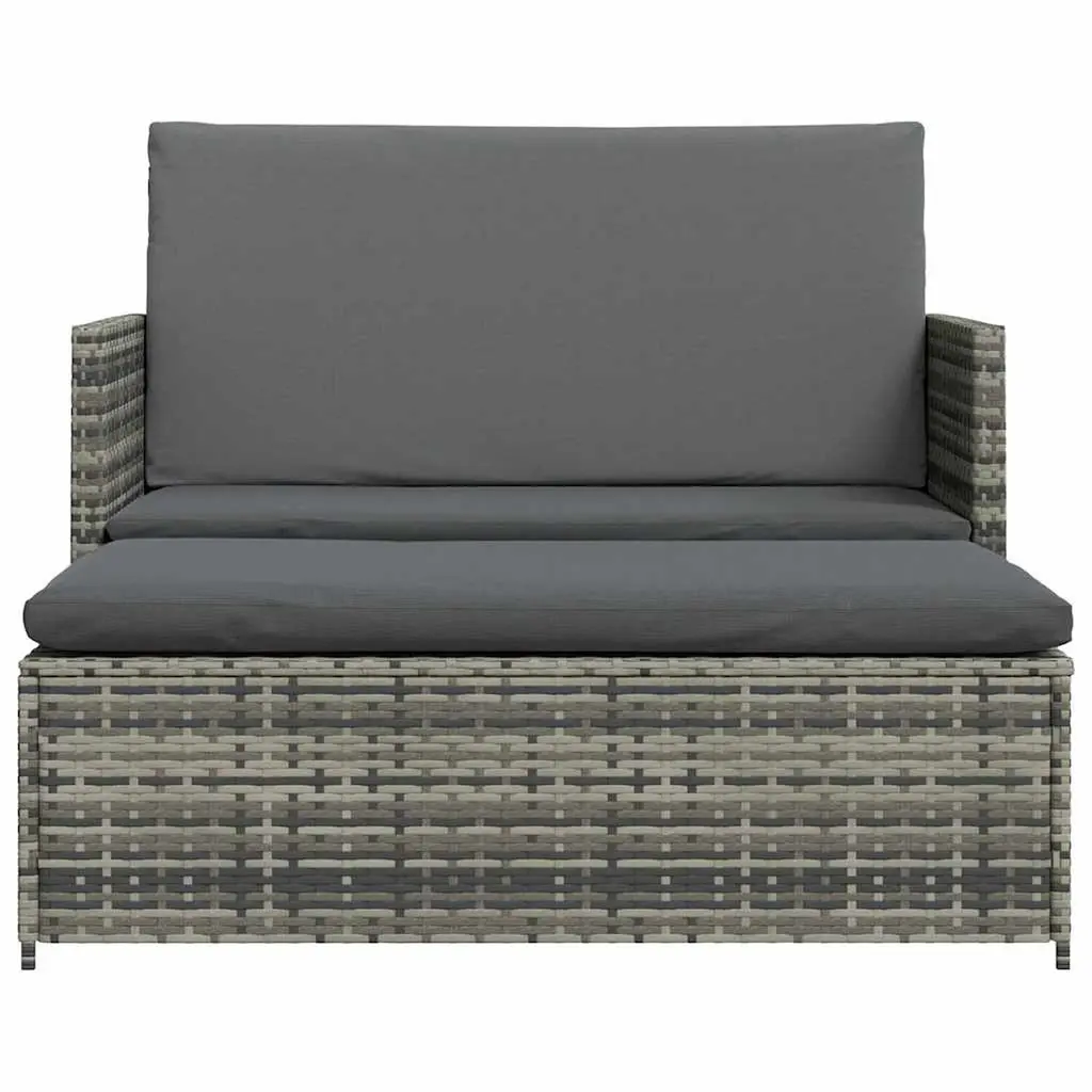 This 2-piece outdoor sofa set is a stylish and comfy addition to any garden, patio, or poolside area. Made from tough synthetic Poly Rattan and durable powder-coated steel, the set is elegant and perfect for chilling out. It’s great for gatherings and can seat two people comfortably, plus it has a handy stool that tucks away under the sofa when not in use. Convertible Design: The adjustable sofa can become a lounge bed, giving you extra space during hangouts while keeping it versatile. Weather Resistant: Made from tough materials, this set can handle outdoor conditions, letting you enjoy your outdoor space without wear and tear worries. Comfortable Cushions: With soft seat cushions, this set offers a great lounging experience for those long outdoor chill times. Stylish Look: With its modern gray tones and smooth feel, this sofa fits right into any outdoor setup, enhancing the overall look. Compact Footprint: The size is smartly designed to fit well on balconies and in smaller gardens, making it practical without skimping on comfort.