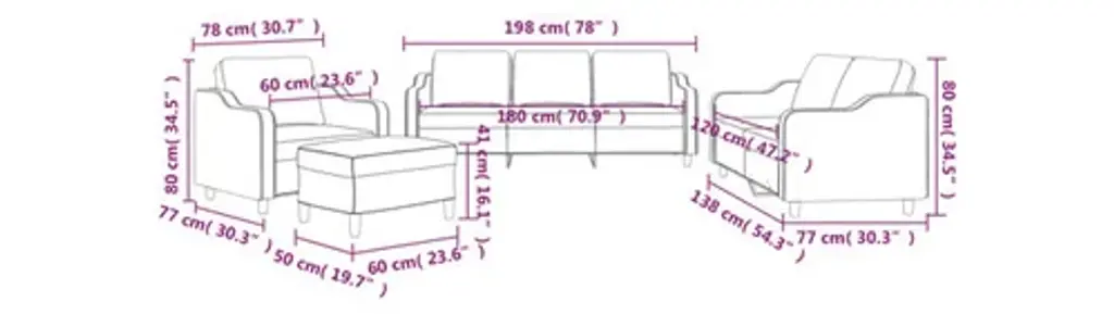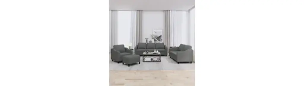 This sofa set is an excellent place for chatting, reading, watching TV, or just relaxing. It is meant to be a focal point in your home.Durable fabric: The fabric features a simple and clean look while remaining breathable and long-lasting.Sturdy and stable frame: The plywood and metal frame of the sofa seating ensures sturdiness and stability.Comfortable seat experience: The sofa is highly comfortable with the thickly padded seat, armrests, and back pillow.Versatile footstool: The footstool is suitable for resting your feet when you lie on a sofa or offering you an additional seat in your room. Additionally, the simple design and compact size make it ideal for almost all your living spaces.Color: Dark grayMaterial: Fabric (100% polyester), metal, textilene, plywoodFilling material: FoamSofa chair:Overall dimensions: 30.7" x 30.3" x 31.5" (W x D x H)Seat width: 23.6"Seat depth: 19.7"2-seater sofa:Overall dimensions: 54.3" x 30.3" x 31.5" (W x D x H)Seat width: 47.2"Seat depth: 19.7"3-seater sofa:Overall dimensions: 78" x 30.3" x 31.5" (W x D x H)Seat width: 70.9"Seat depth: 19.7"Seat height from the ground: 16.1"Armrest height from the ground: 25.2"Footstool dimensions: 23.6" x 19.7" x 16.1" (W x D x H)Assembly required: YesDelivery contains:1 x Sofa chair1 x 2-seater sofa1 x 3-seater sofa1 x Footstool6 x Cushion