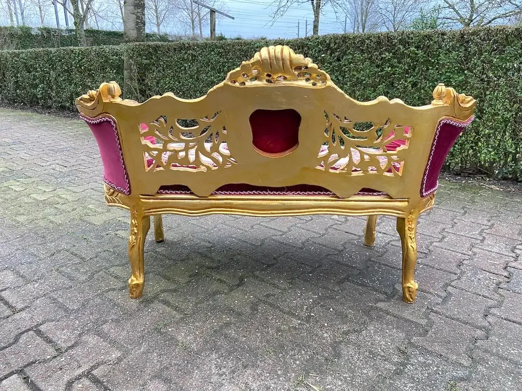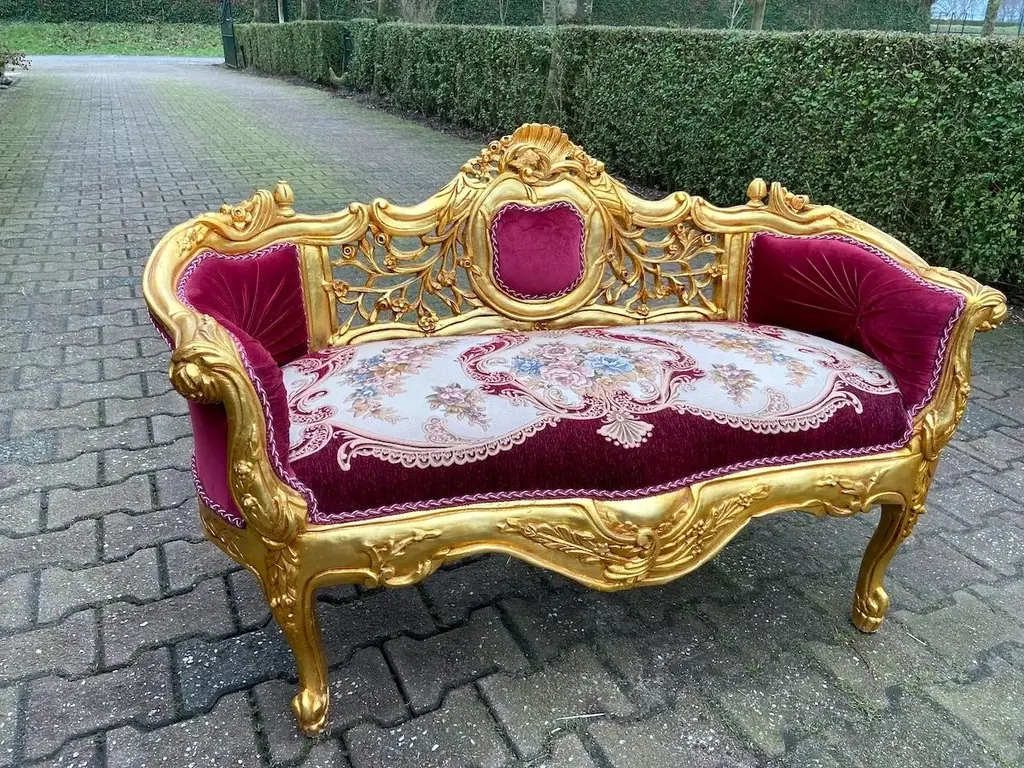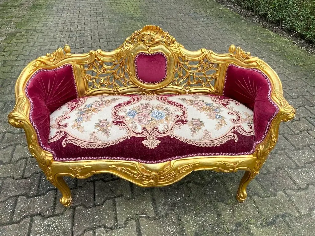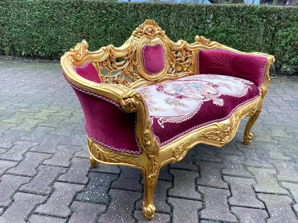 Exquisite Vintage French Louis XVI Settee – Hand-Carved Gilded Beech Frame & Sumptuous Red Velvet Upholstery Product Overview: Indulge in timeless elegance with this breathtaking French Louis XVI-style settee, a refined statement piece that captures the opulence and sophistication of 18th-century French design. Crafted with a hand-carved solid beech frame, this vintage masterpiece is meticulously re-finished in rich antique gold gilding, enhancing its intricate floral motifs and regal curves. Upholstered in deep red velvet damask, this settee exudes warmth and grandeur, making it an ideal focal point in a luxurious living space, bedroom, or formal sitting area. Whether you're a passionate antique collector, an interior designer, or simply someone with a love for classic European aesthetics, this authentic Louis XVI-style settee will elevate your space with its undeniable charm and history. Key Features: ✔ Authentic Vintage Craftsmanship: A true Louis XVI-style treasure, hand-carved by skilled artisans with detailed floral and acanthus leaf motifs. ✔ Plush Red Velvet Damask Upholstery: Recently restored with high-quality velvet damask fabric, offering both softness and durability. ✔ Gold-Gilded Beechwood Frame: The solid beech frame is adorned with an exquisite antique gold patina, adding a regal touch. ✔ Timeless European Elegance: Inspired by the refined aesthetic of 18th-century France, this settee seamlessly blends with both classic and modern interiors. ✔ Aged Beauty & Character: As a genuine vintage piece, it bears subtle signs of time, adding to its historical charm and authenticity. Approximate Dimensions: Width: 120 cm | 47 inches Depth: 50 cm | 20 inches Height: 77 cm | 30 inches Seat Height: 46 cm | 18 inches Shipping & Delivery: ✔ Professionally packed in a custom wooden crate for secure transport. ✔ Fully Insured & Tracked: We ensure your settee arrives safely with full insurance and tracking. ✔ Shipping Method: Secure and efficient sea freight. Why This French Louis XVI Settee? ✔ Handcrafted vintage artistry with luxurious materials ✔ Gorgeous gold-gilded detailing & classic Louis XVI design ✔ Perfect for collectors, interior designers & antique enthusiasts ✔ A rare, timeless statement piece for sophisticated interiors Make This Exquisite French Settee Yours Today! Transform your home with the elegance of vintage French luxury. The deep red velvet upholstery and gilded beech frame make this settee a showstopping centerpiece in any space. Order Now & Experience Classic European Elegance!