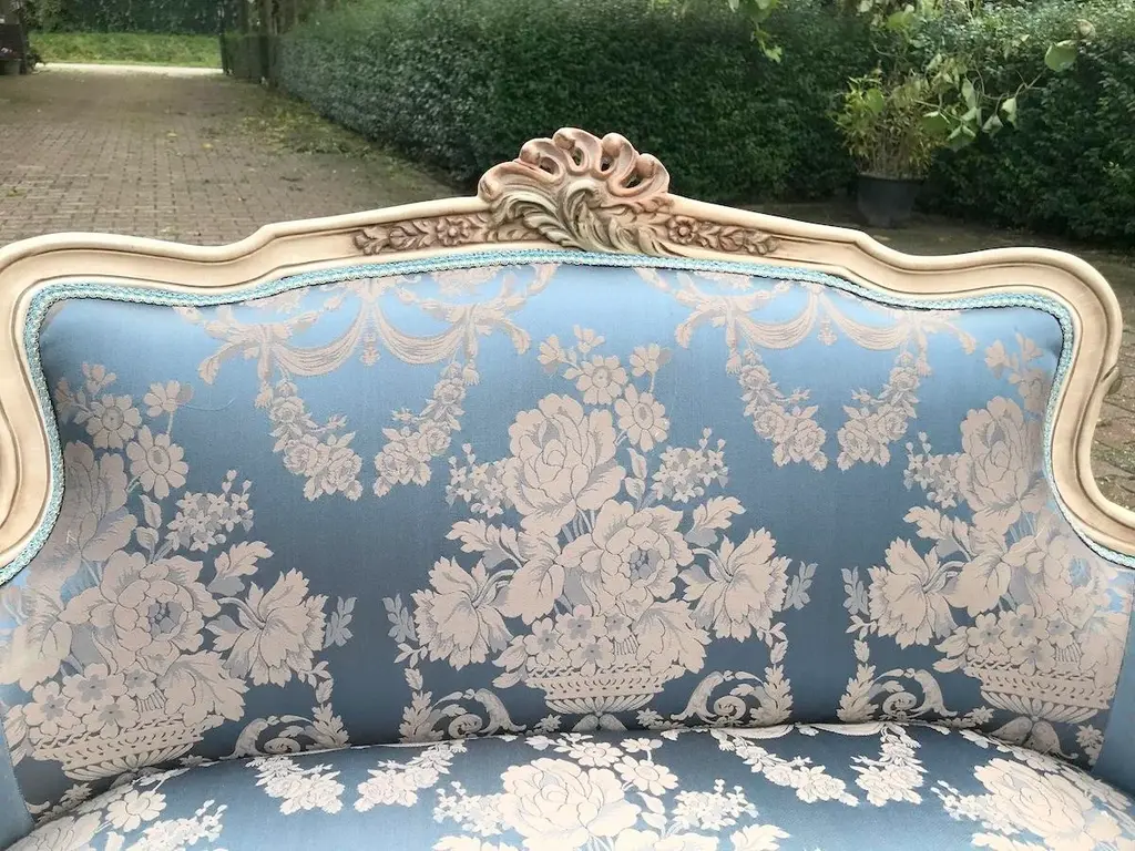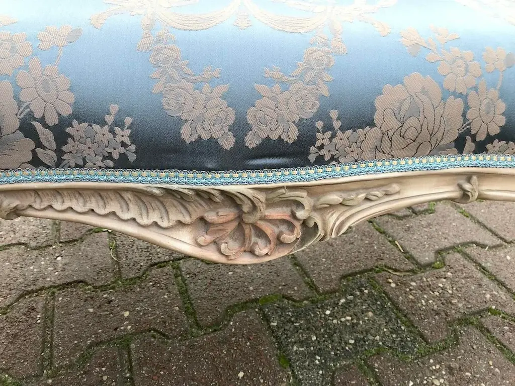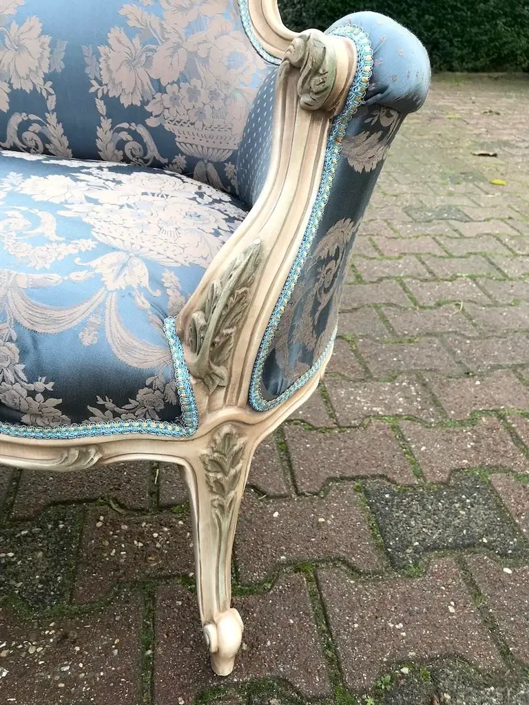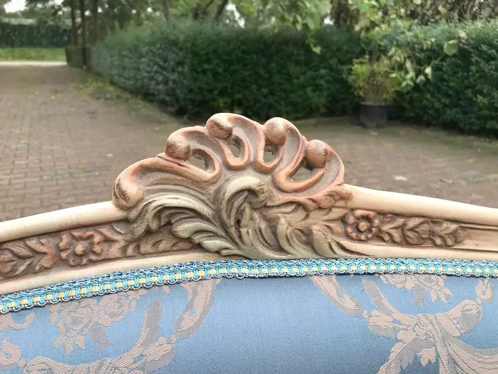 Vintage French Louis XVI Style Settee in Antique Cream Beech with Blue Damask Upholstery Date/Period: Mid to Late 20th Century Maker/Brand: Handcrafted (France) Style: French Louis XVI Color: Antique Cream & Blue Material: Beech Wood & Silk-Cotton Damask Category: Settee / Bench Seating Number of Pieces: 1 Bring a breath of classic French romance into your home with this elegant vintage Louis XVI style settee. Handcrafted in France and recently restored, this piece harmoniously blends ornate design with everyday functionality. It's an exquisite accent that evokes 18th-century refinement, yet is versatile enough for modern interiors. The solid beech wood frame has been meticulously refinished in an antique cream tone, delicately enhanced by hand-painted pastel floral accents—a subtle nod to antique French charm. Intricately carved details throughout the frame showcase true craftsmanship, particularly in the floral motifs and fluted legs typical of the Louis XVI style. Upholstered in a stunning blue damask fabric with a soft cream floral pattern, the seat and backrest exude luxury and elegance. A contrasting dotted motif graces the back and sides, offering a delightful visual detail from every angle. The upholstery is crafted from a silk-cotton blend and paired with all-new padding for enhanced comfort and long-term durability. Key Features: Authentic French Louis XVI design Sturdy solid beech frame, hand-finished in antique cream Hand-painted floral detailing in soft pastel tones Rich blue damask upholstery with floral and dotted patterns Newly reupholstered with high-quality padding and materials Timeless silhouette ideal for entryways, living rooms, nurseries, or boudoirs Approximate Dimensions: Width: 50 inches (127 cm) Depth (seat): 19 inches (48 cm) Depth (overall): 24 inches (61 cm) Height: 34 inches (86 cm) Seat Height: 19.5 inches (49.5 cm) Condition: Very good vintage condition. The frame has been professionally refinished, and the upholstery is brand new. Minor signs of previous use may be visible but do not detract from the overall beauty or function. Shipping & Packaging: This settee will be securely packed in a custom-made wooden crate and shipped with full tracking and insurance from our warehouse in the Netherlands. The piece will arrive ready to infuse your space with elegance and French charm. Whether placed in a formal salon or a cozy reading nook, this vintage Louis XVI style settee offers a graceful and inviting presence that is both artful and practical.