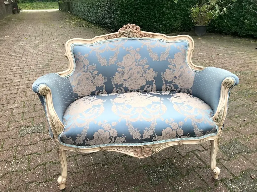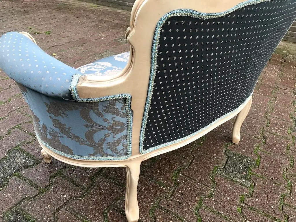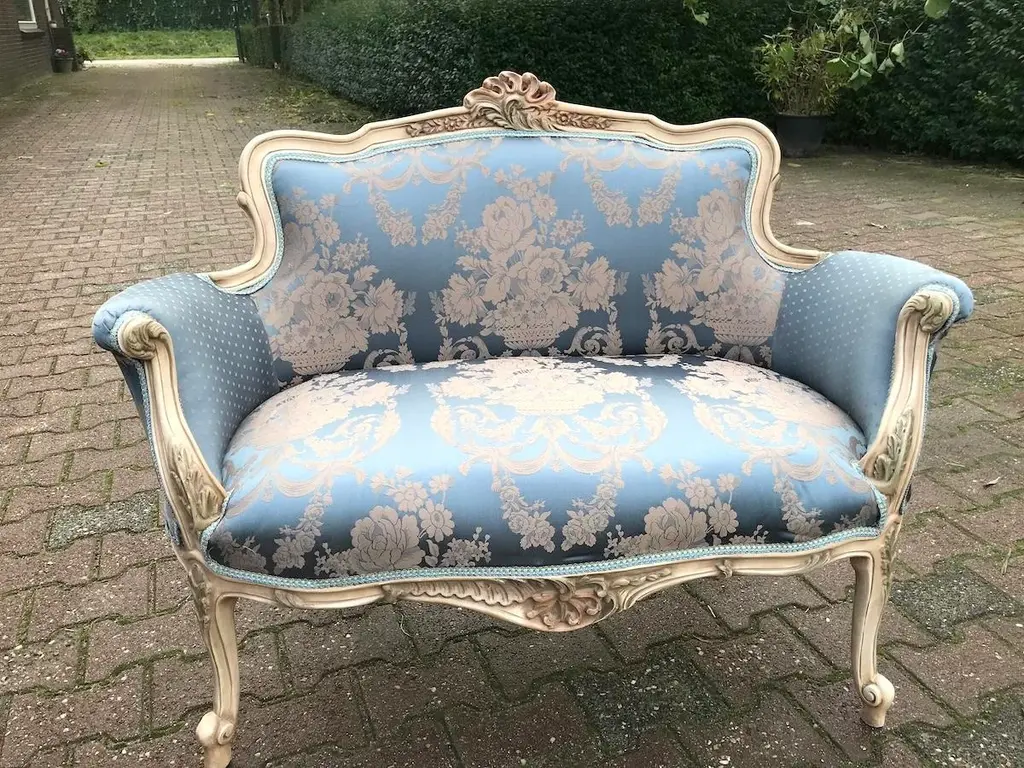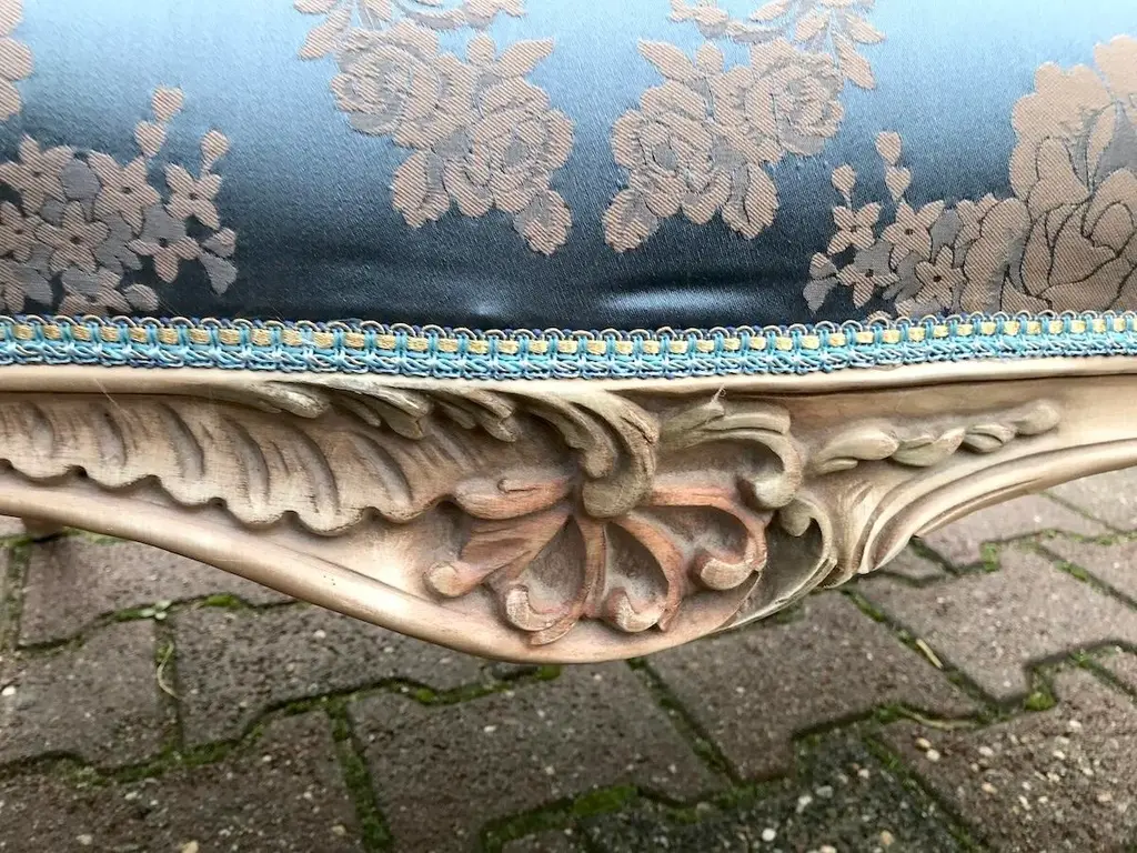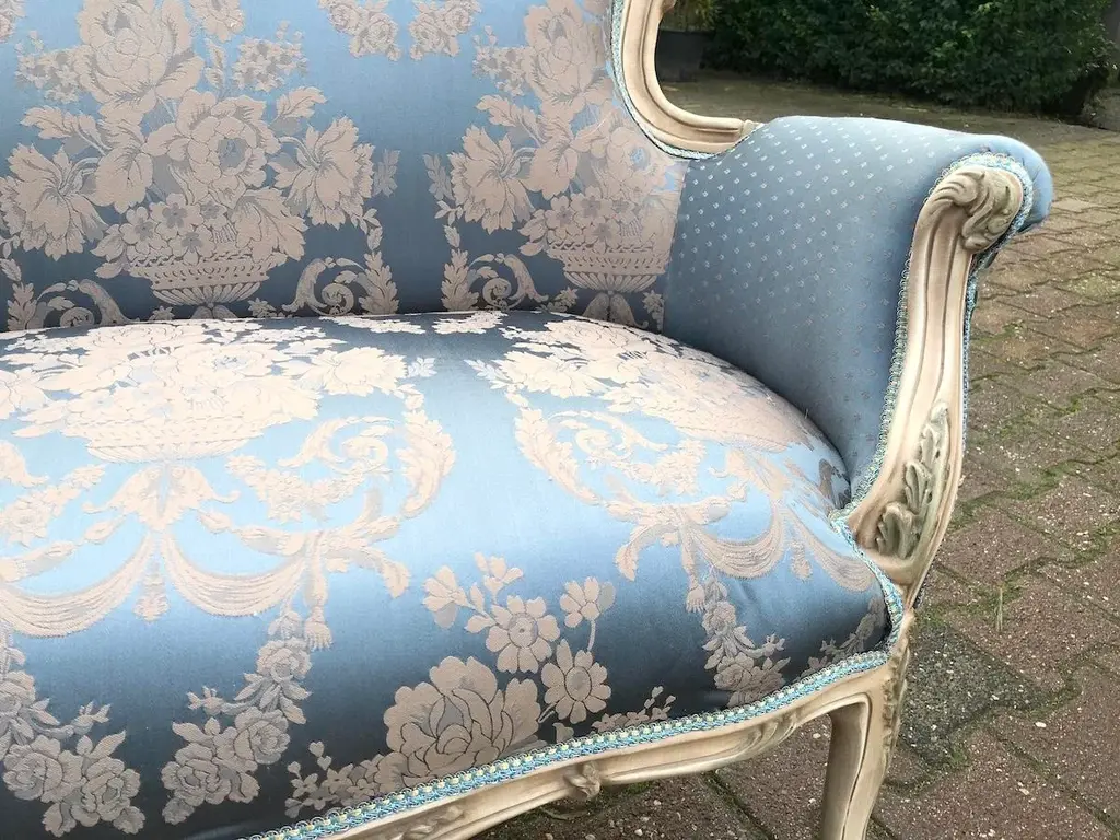 Vintage French Louis XVI Style Settee in Antique Cream Beech with Blue Damask Upholstery Date/Period: Mid to Late 20th Century Maker/Brand: Handcrafted (France) Style: French Louis XVI Color: Antique Cream & Blue Material: Beech Wood & Silk-Cotton Damask Category: Settee / Bench Seating Number of Pieces: 1 Bring a breath of classic French romance into your home with this elegant vintage Louis XVI style settee. Handcrafted in France and recently restored, this piece harmoniously blends ornate design with everyday functionality. It's an exquisite accent that evokes 18th-century refinement, yet is versatile enough for modern interiors. The solid beech wood frame has been meticulously refinished in an antique cream tone, delicately enhanced by hand-painted pastel floral accents—a subtle nod to antique French charm. Intricately carved details throughout the frame showcase true craftsmanship, particularly in the floral motifs and fluted legs typical of the Louis XVI style. Upholstered in a stunning blue damask fabric with a soft cream floral pattern, the seat and backrest exude luxury and elegance. A contrasting dotted motif graces the back and sides, offering a delightful visual detail from every angle. The upholstery is crafted from a silk-cotton blend and paired with all-new padding for enhanced comfort and long-term durability. Key Features: Authentic French Louis XVI design Sturdy solid beech frame, hand-finished in antique cream Hand-painted floral detailing in soft pastel tones Rich blue damask upholstery with floral and dotted patterns Newly reupholstered with high-quality padding and materials Timeless silhouette ideal for entryways, living rooms, nurseries, or boudoirs Approximate Dimensions: Width: 50 inches (127 cm) Depth (seat): 19 inches (48 cm) Depth (overall): 24 inches (61 cm) Height: 34 inches (86 cm) Seat Height: 19.5 inches (49.5 cm) Condition: Very good vintage condition. The frame has been professionally refinished, and the upholstery is brand new. Minor signs of previous use may be visible but do not detract from the overall beauty or function. Shipping & Packaging: This settee will be securely packed in a custom-made wooden crate and shipped with full tracking and insurance from our warehouse in the Netherlands. The piece will arrive ready to infuse your space with elegance and French charm. Whether placed in a formal salon or a cozy reading nook, this vintage Louis XVI style settee offers a graceful and inviting presence that is both artful and practical.