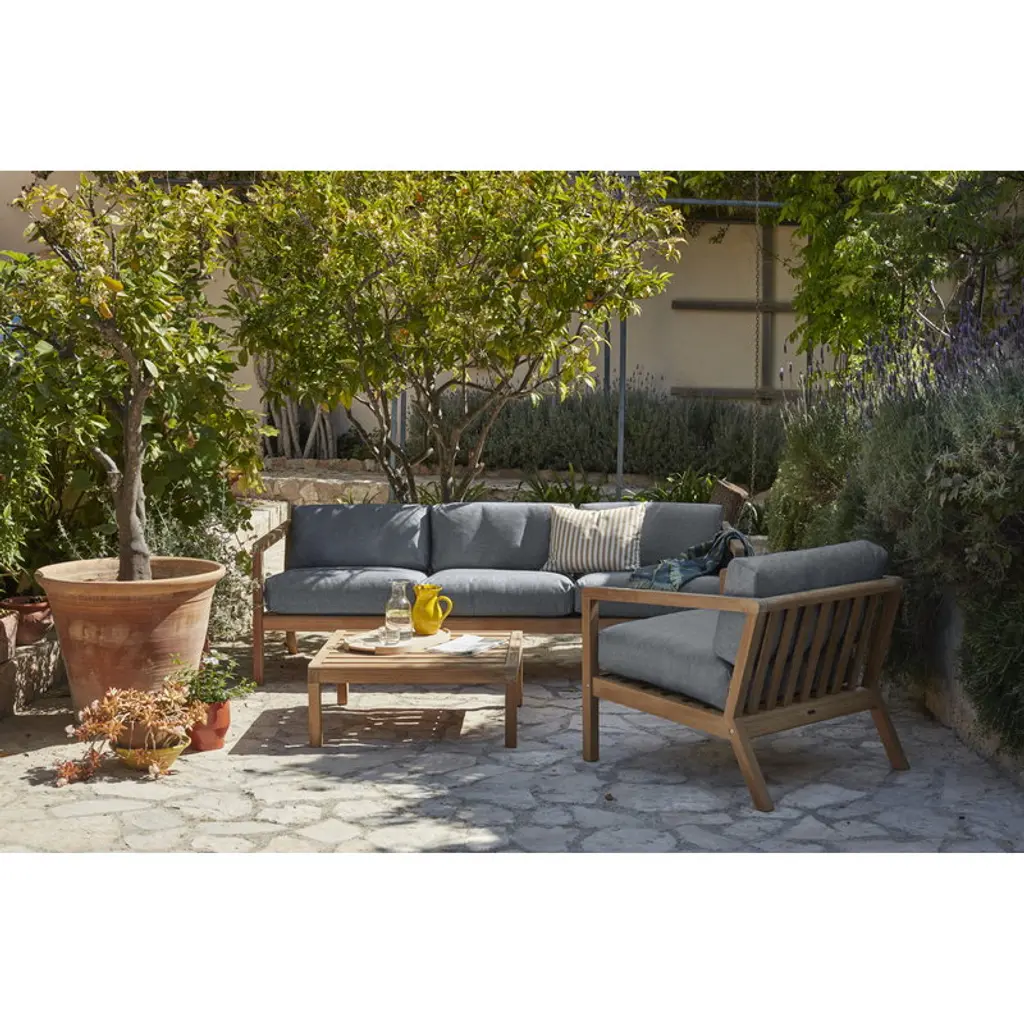 Skagerak’s Virkelyst sofa is so comfortable that you could easily think it’s designed for indoor use. However, the two-seater sofa, consisting of a minimalist teak frame and plush cushions, is specially designed for outdoors and its upholstery is therefore very durable as well as water and dirt resistant. The hypoallergenic Fossflakes inside the cushions are known as a very breathable padding material that maintains its shape over time. . Virkelyst is a modern outdoor furniture range, designed by SAYS WHO for Skagerak, combining a clean-lined design with the natural appeal of teak wood which, in time, will develop a beautiful silvery gray patina. Combine your favorite Virkelyst furniture to get a stylish sofa set for your garden or porch or create a small summer oasis on the balcony.