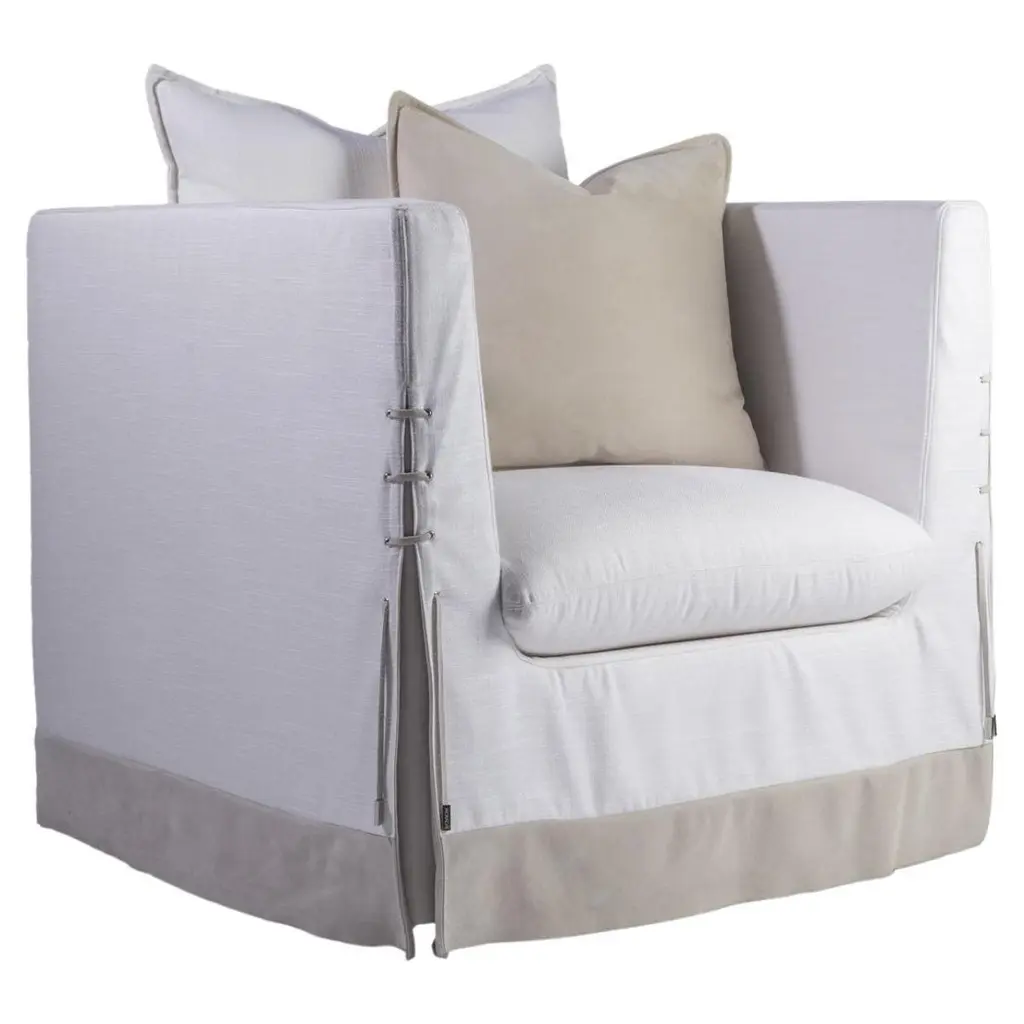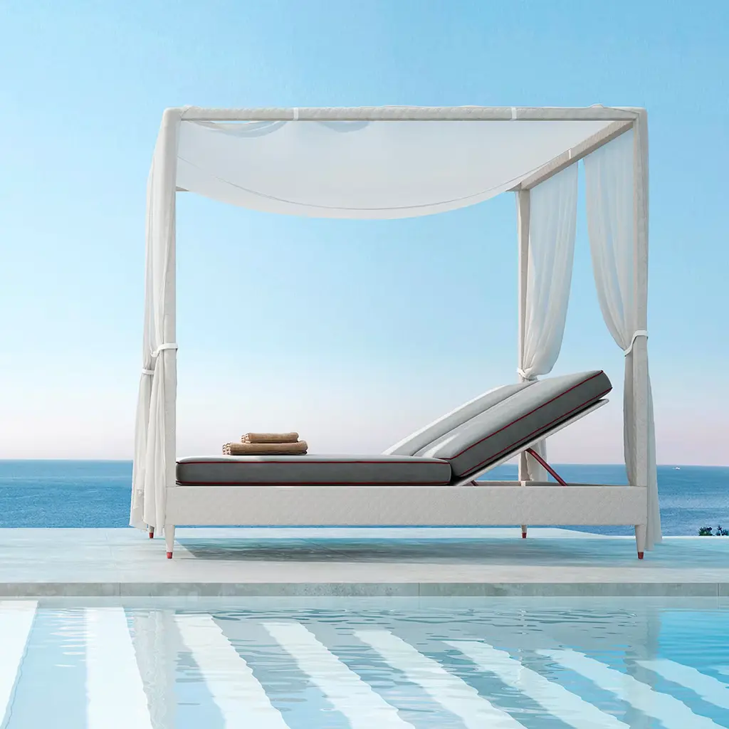 An absolute must-have in any outdoor decor, this daybed will turn every moment into a relaxing experience and bring life to any outdoor entertainment events. The white handwoven resin-covered aluminum frame features a white canopy gently draped over the four posts, filtering the light and creating privacy without stopping the breeze. The two single beds have adjustable back and polyurethane-padded cushions in gray with white piping made of Tyvek, a special breathable, waterproof, and mold-resistant material designed for outdoors. This enticing piece is also available in black, red, and ivory.