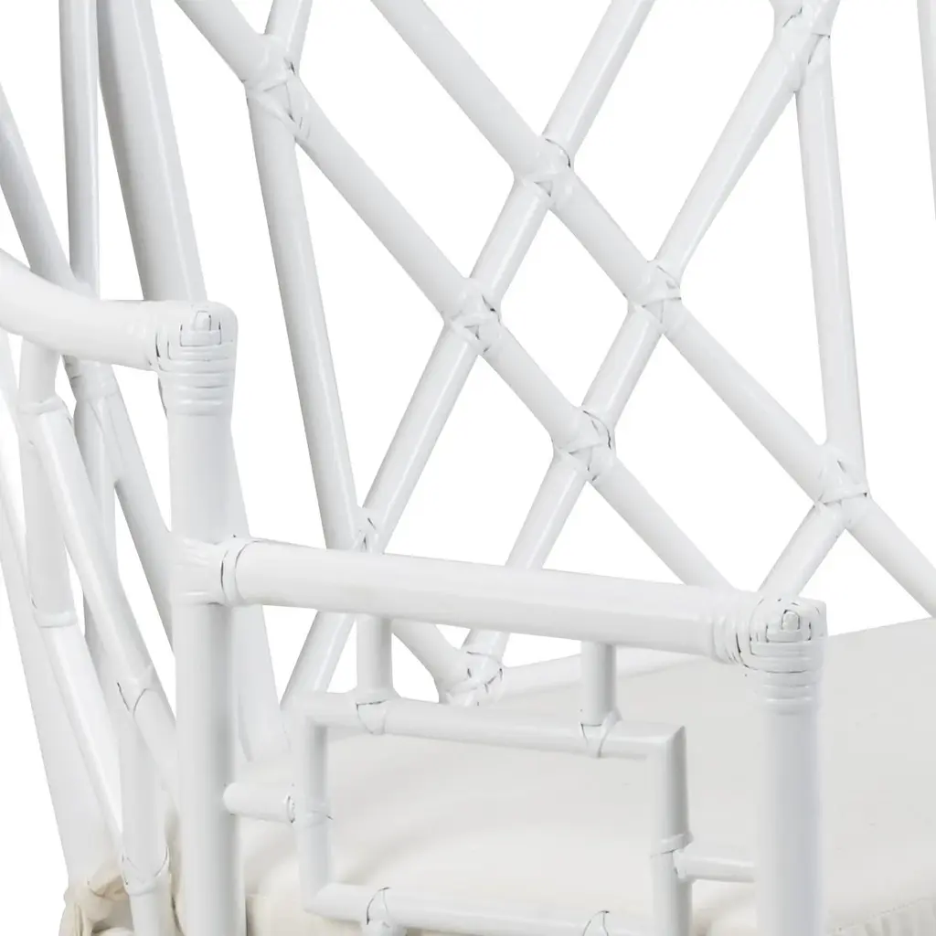 white finish on rattan fretwork curved sette with attached off white fabric cushion.