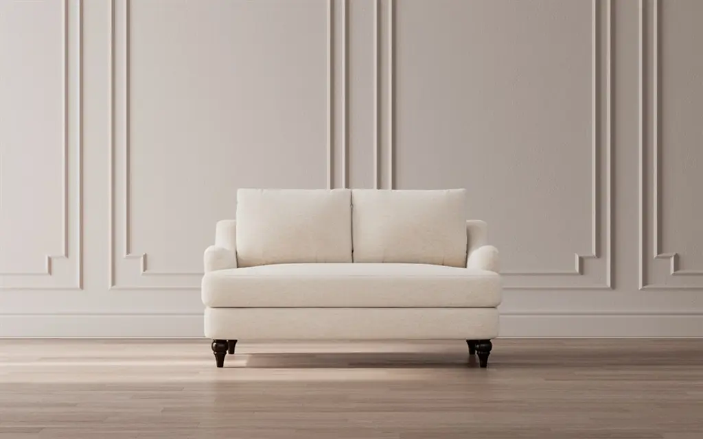 A Kathy Kuo Home exclusive, our 60” Willett loveseat feels timeless and fresh, a perfect transitional piece for living rooms of any style. Turned wood legs and sloped, gently rounded arms add a charming, nostalgic feel, while the elongated bench seat offers a clean, sophisticated look. We designed Willett with a custom cushion fill—hypoallergenic Trillium® fiber holds its shape and offers all the comfort of down without the fluffing maintenance.