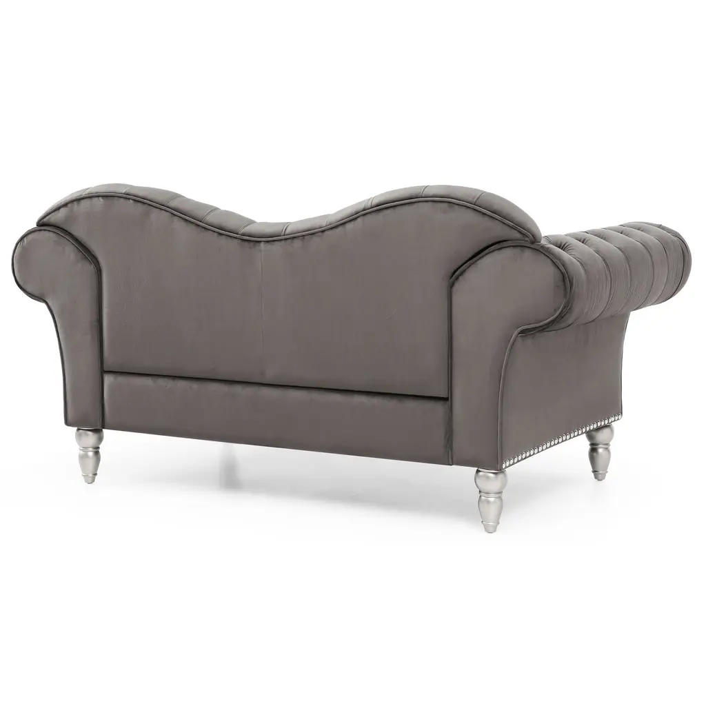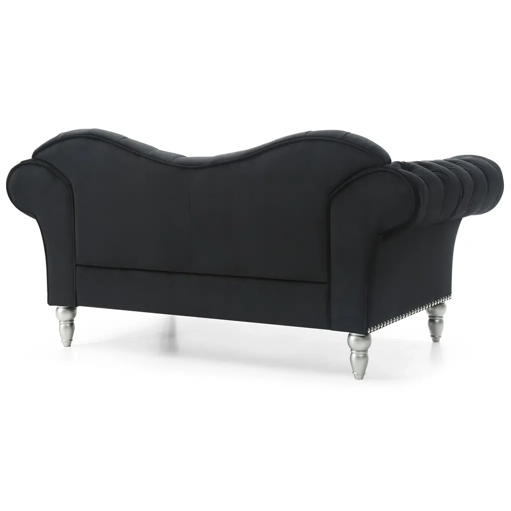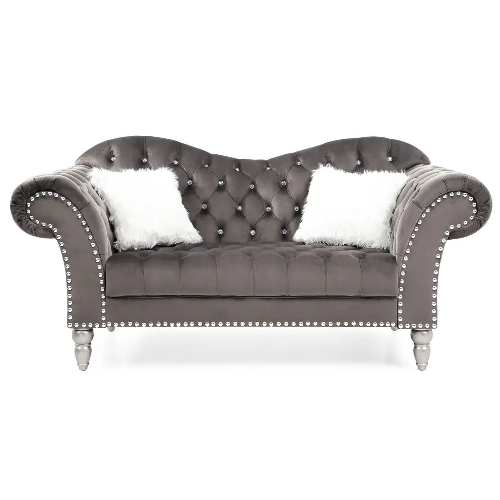 The Wilshire Velvet Tufted Loveseat by Glory Furniture is the perfect balance of style and comfort. The loveseat features a sweetheart back with button, jewel tufting. This oversized loveseat has an attached cushion and large nailheads with wood legs that truly make a statement. The loveseat has deep seating and ships with the back removed for easy, tool-free assembly. Elevate the style of your living room with this beautiful loveseat.Features