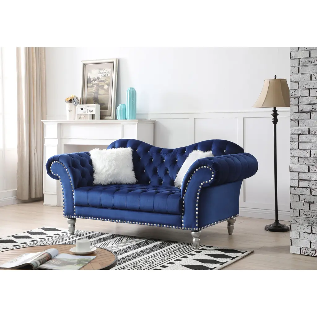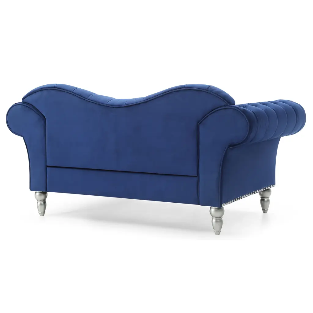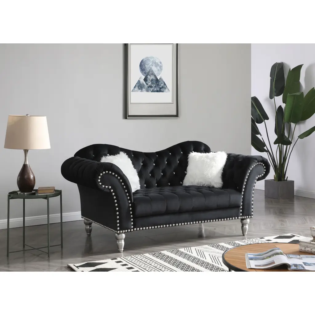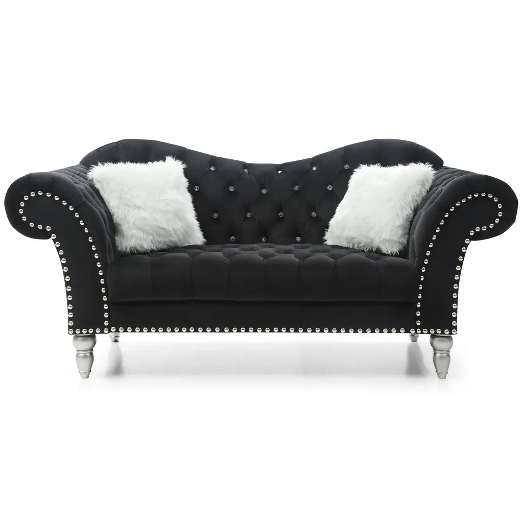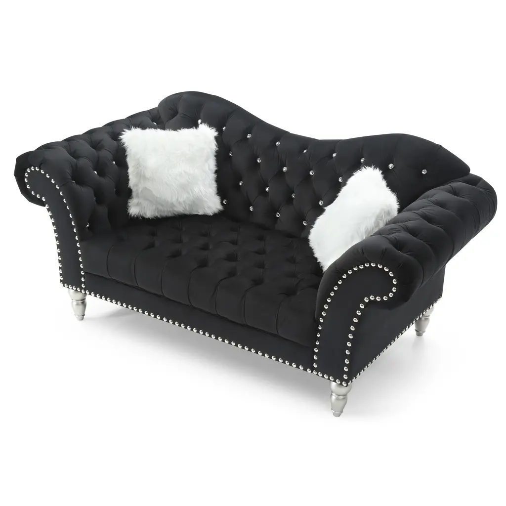 The Wilshire Velvet Tufted Loveseat by Glory Furniture is the perfect balance of style and comfort. The loveseat features a sweetheart back with button, jewel tufting. This oversized loveseat has an attached cushion and large nailheads with wood legs that truly make a statement. The loveseat has deep seating and ships with the back removed for easy, tool-free assembly. Elevate the style of your living room with this beautiful loveseat.Features