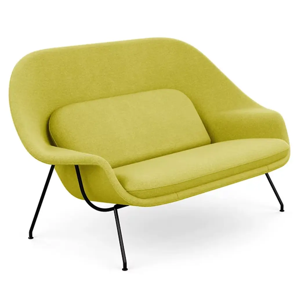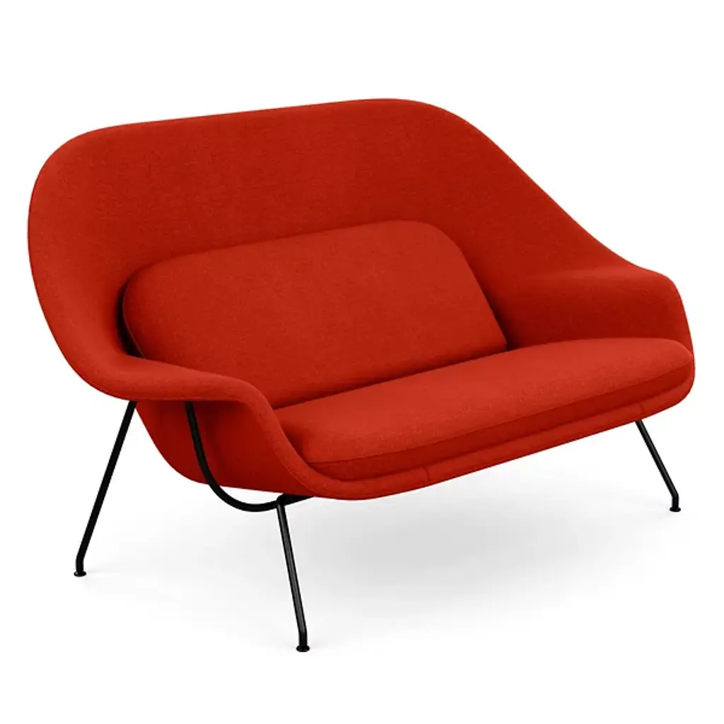 A Womb Chair fit for two. Designed in 1948, the Womb Settee was brought back into production in 2015. The double-wide design offers a comforting oasis of calm for the home or office.The Womb Settee was developed in anticipation of Eero Saarinen’s architectural commission for the General Motors Technical Center in Warren, Michigan—a 25-building complex requiring furniture for 5,000 stressed employees. Saarinen responded with a slim, sculptural, inviting settee, completely unlike the clumsy, oversized models popular at the time. “These dreadnaughts have disappeared from modern interiors partly because they were designed for an era that tried to impress by sheer mass,” wrote Saarinen. “Now, more than ever, we need to relax.”