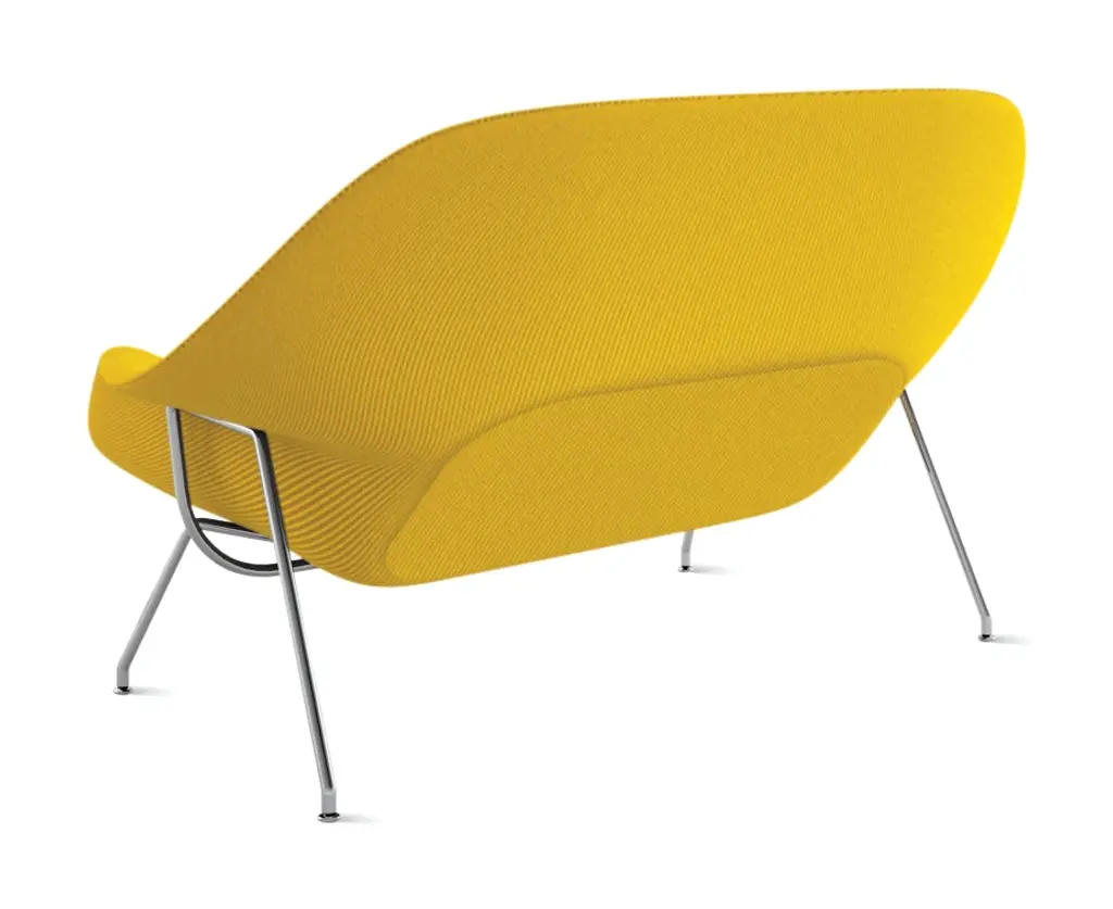 A Womb Chair fit for two. Designed in 1948, the Womb Settee was brought back into production in 2015. The double-wide design offers a comforting oasis of calm for the home or office.The Womb Settee was developed in anticipation of Eero Saarinen’s architectural commission for the General Motors Technical Center in Warren, Michigan—a 25-building complex requiring furniture for 5,000 stressed employees. Saarinen responded with a slim, sculptural, inviting settee, completely unlike the clumsy, oversized models popular at the time. “These dreadnaughts have disappeared from modern interiors partly because they were designed for an era that tried to impress by sheer mass,” wrote Saarinen. “Now, more than ever, we need to relax.”