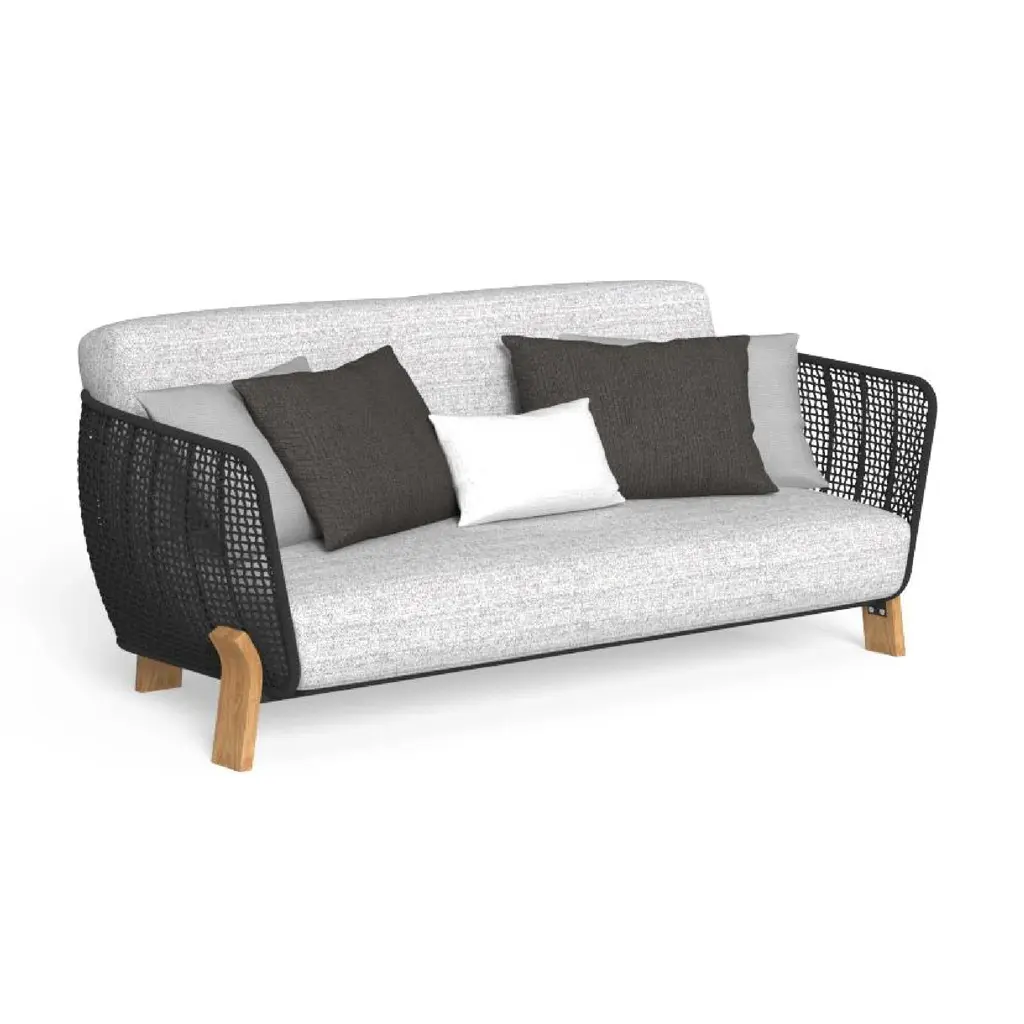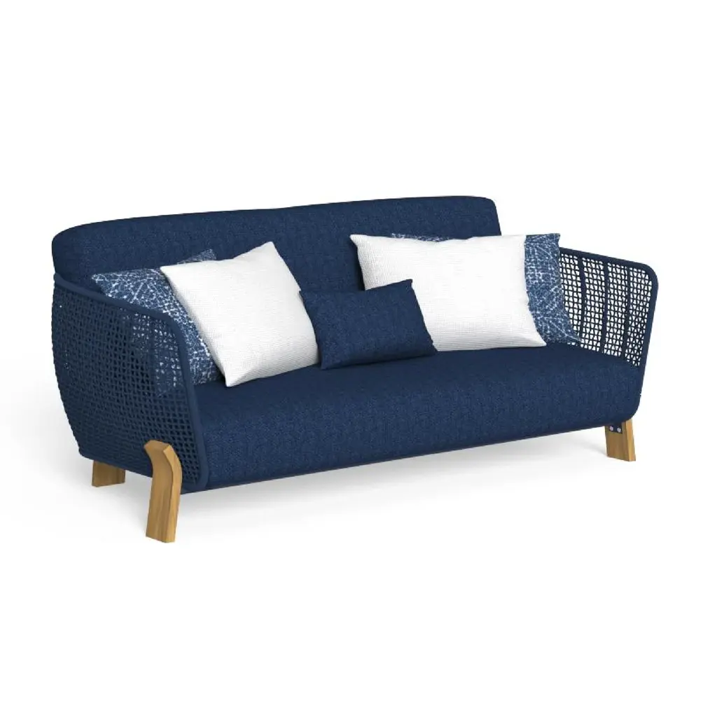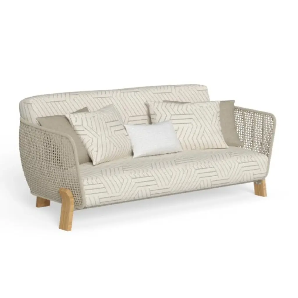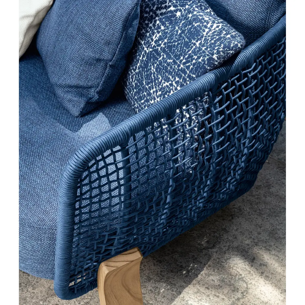 Sinuous lines in the armrests and geometric shapes in the seats flow together into the Argo love seat sofa, perfect to enjoy a relaxing moment in your leisure time. The curved wooden feet, externally fixed, are the key element of this sofa. The armrests and the wide backrest, made up of nautical woven ropes, create a refined play between material and volume, in line with the style of the whole collection. The quick dry foam padding of the cushions, along with the weather- resistant fabrics, allow you to decorate your outdoor area in a functional way.