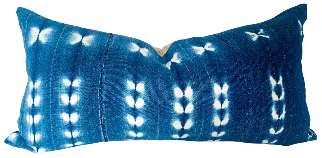 One African Indigo lumbar throw pillow made from vintage hand-woven and hand-printed indigo mud cloth from Burkina Fasso in indigo blue with gold strands. New cotton fabric backs with zipper closures. New goose feather-and-down fill inserts.