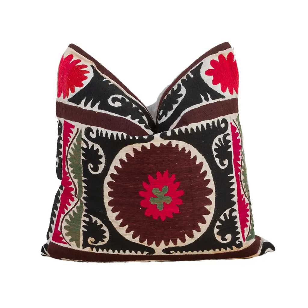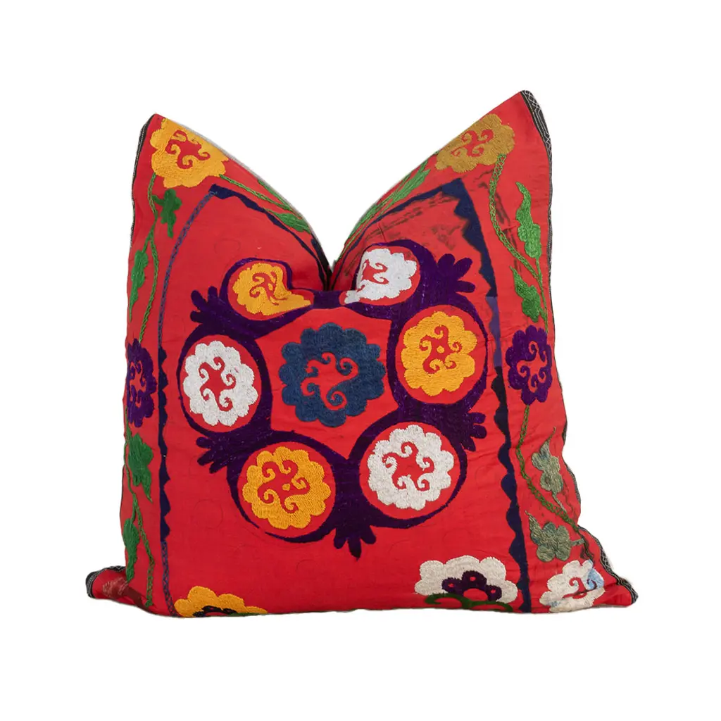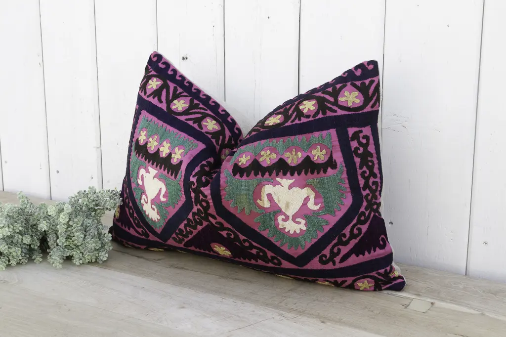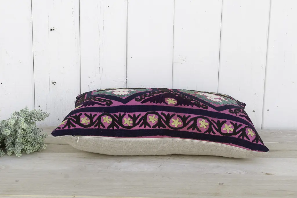 Our collection of Suzani tapestries have been repurposed and made into one of a kind pillows featuring beautiful hand done embroidery, with colorful thread work in a variety of flowers, leaves & vines motif. This Suzani bohemian pillow has been reimagined for today’s interiors with a modern linen backing and hidden zipper closure. Add this antique Suzani pillow to create a globally-inspired look or to add charm and color into any room. Pillow comes with a custom down blend filler included.