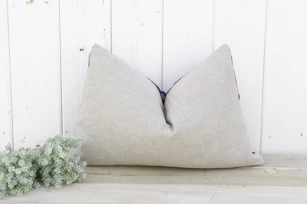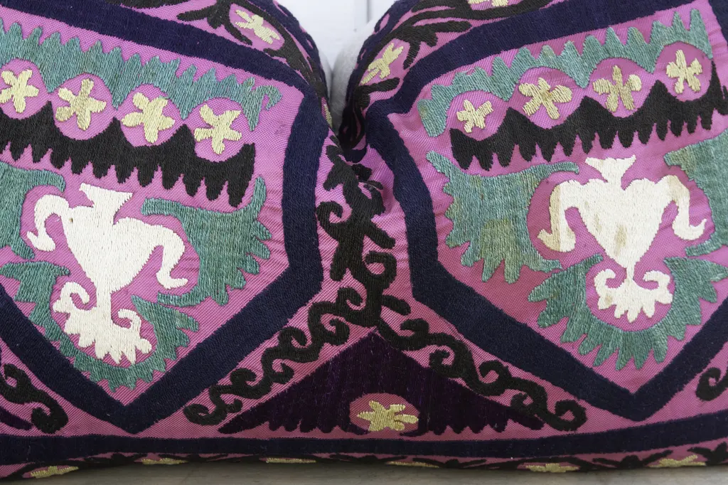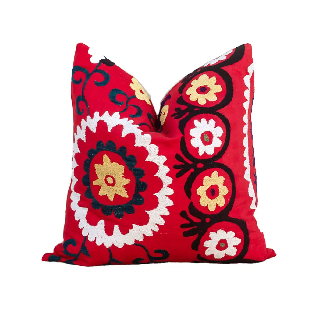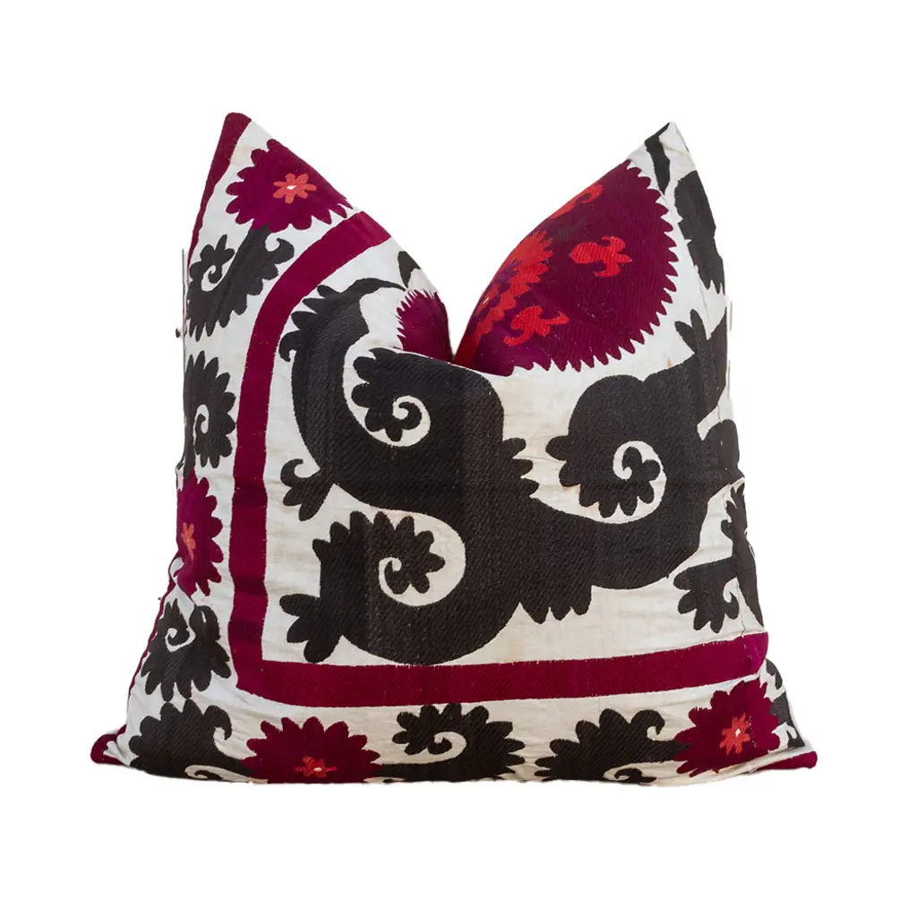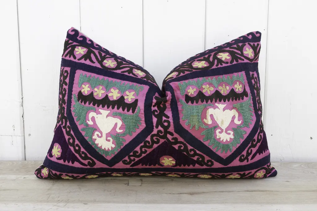 Our collection of Suzani tapestries have been repurposed and made into one of a kind pillows featuring beautiful hand done embroidery, with colorful thread work in a variety of flowers, leaves & vines motif. This Suzani bohemian pillow has been reimagined for today’s interiors with a modern linen backing and hidden zipper closure. Add this antique Suzani pillow to create a globally-inspired look or to add charm and color into any room. Pillow comes with a custom down blend filler included.