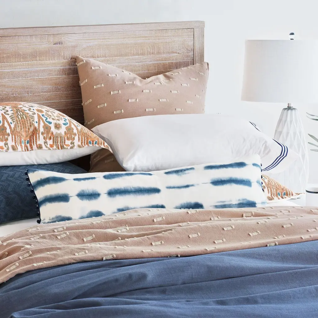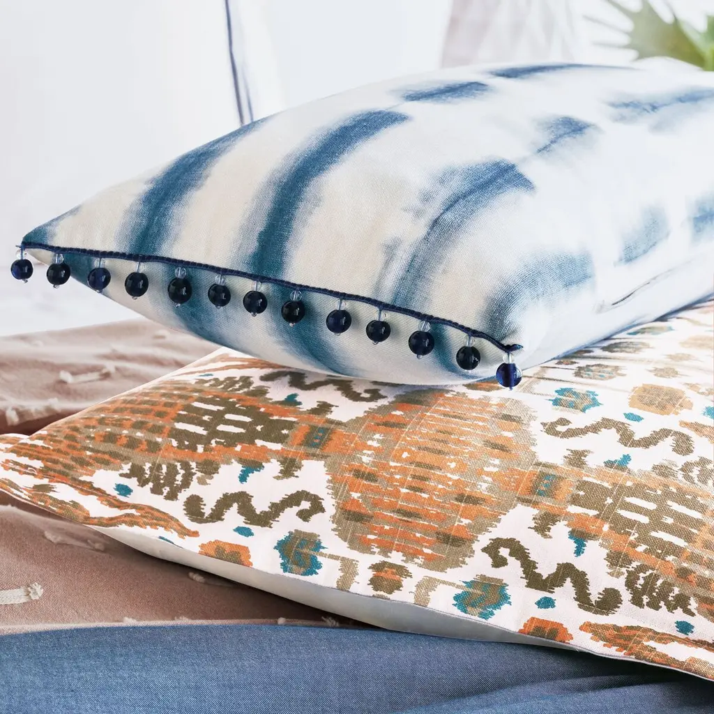 Experience the elegance of this oblong pillow, crafted from shibori-inspired 100% cotton fabric. The self-backed design is accentuated with beaded trim on each side, adding a touch of sophistication. A pillow insert is included for your convenience, and the zipper closure ensures easy care. For best results, dry clean only.