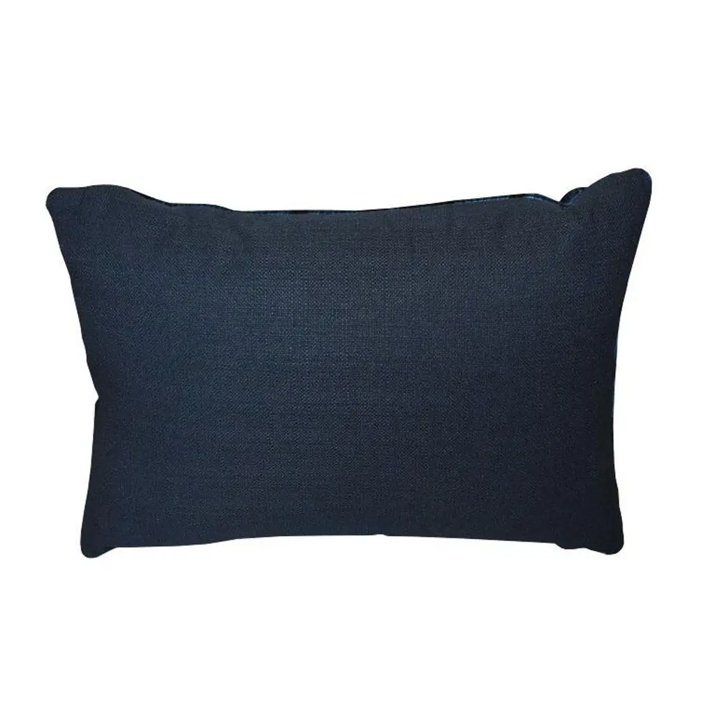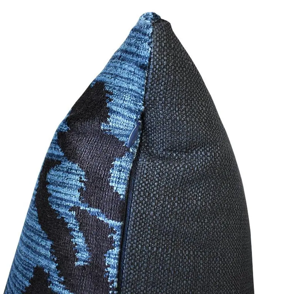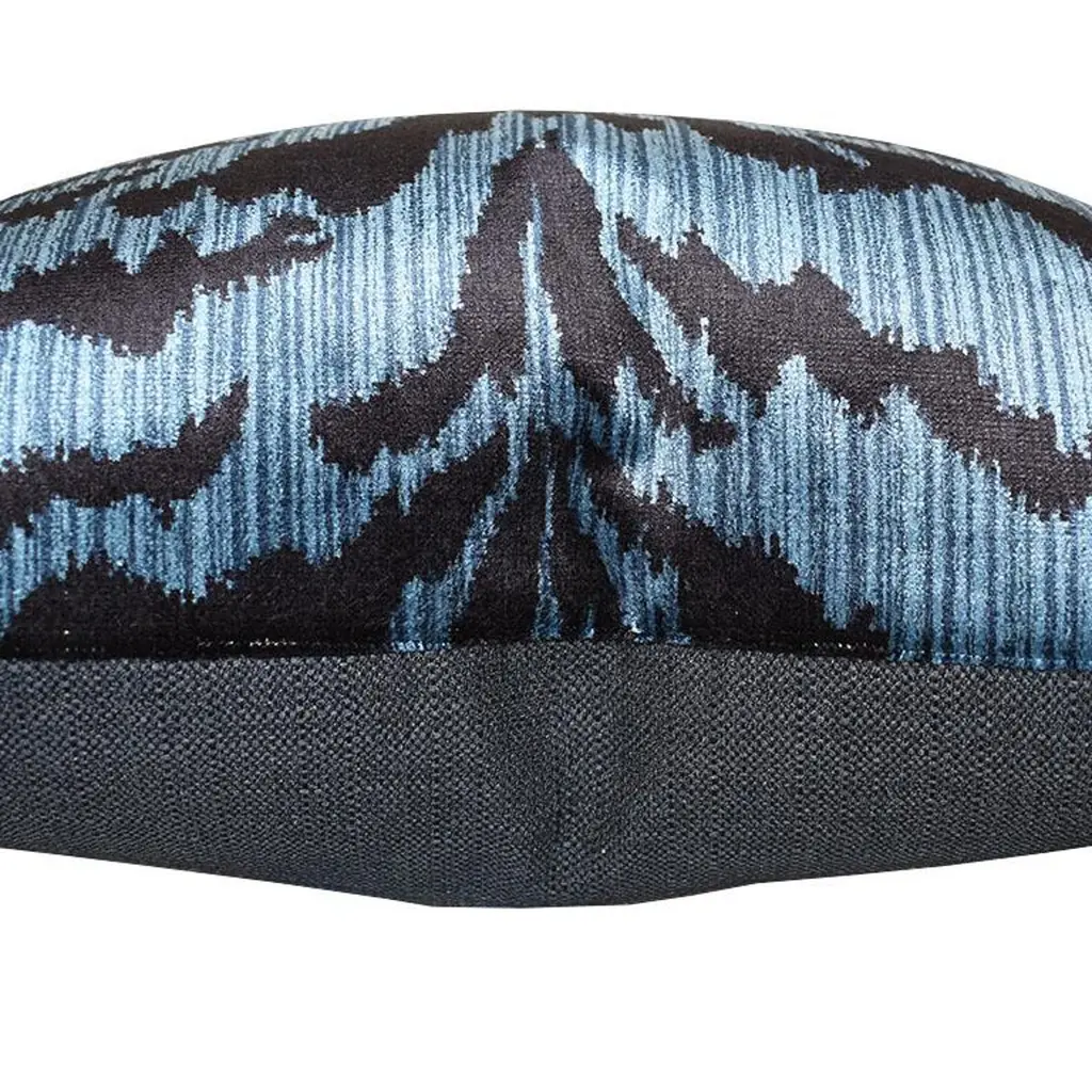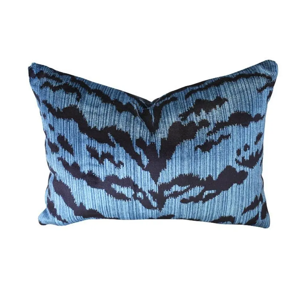 An animal motif tiger print lumbar pillow in navy blue and black. Multiple available. The front features a gorgeous thick velvet animal print in blue and black velvet. The back features crisp black linen. Each pillow is down-filled with a knife edge and zipper at the bottom. The fabric is designer and originates in Belgium.