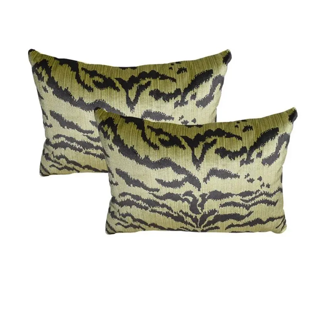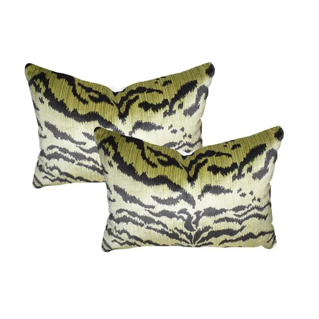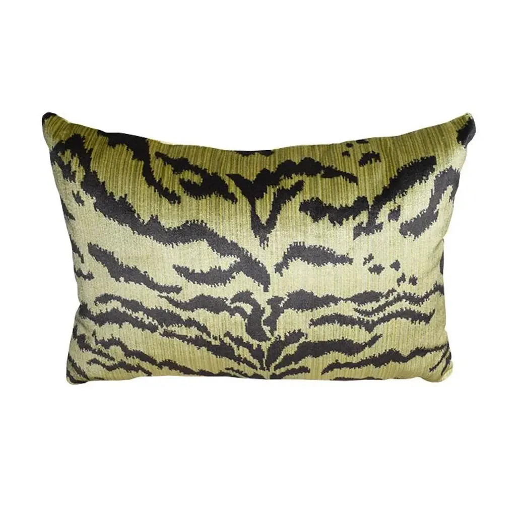 Animal motif tiger print lumbar pillow. Multiple available. The front features a gorgeous thick velvet animal print in green and black. The back features crisp white linen. Down-filled. Knife edge with zipper at the bottom. Fabric is after Scalamandre and originates in Belgium.