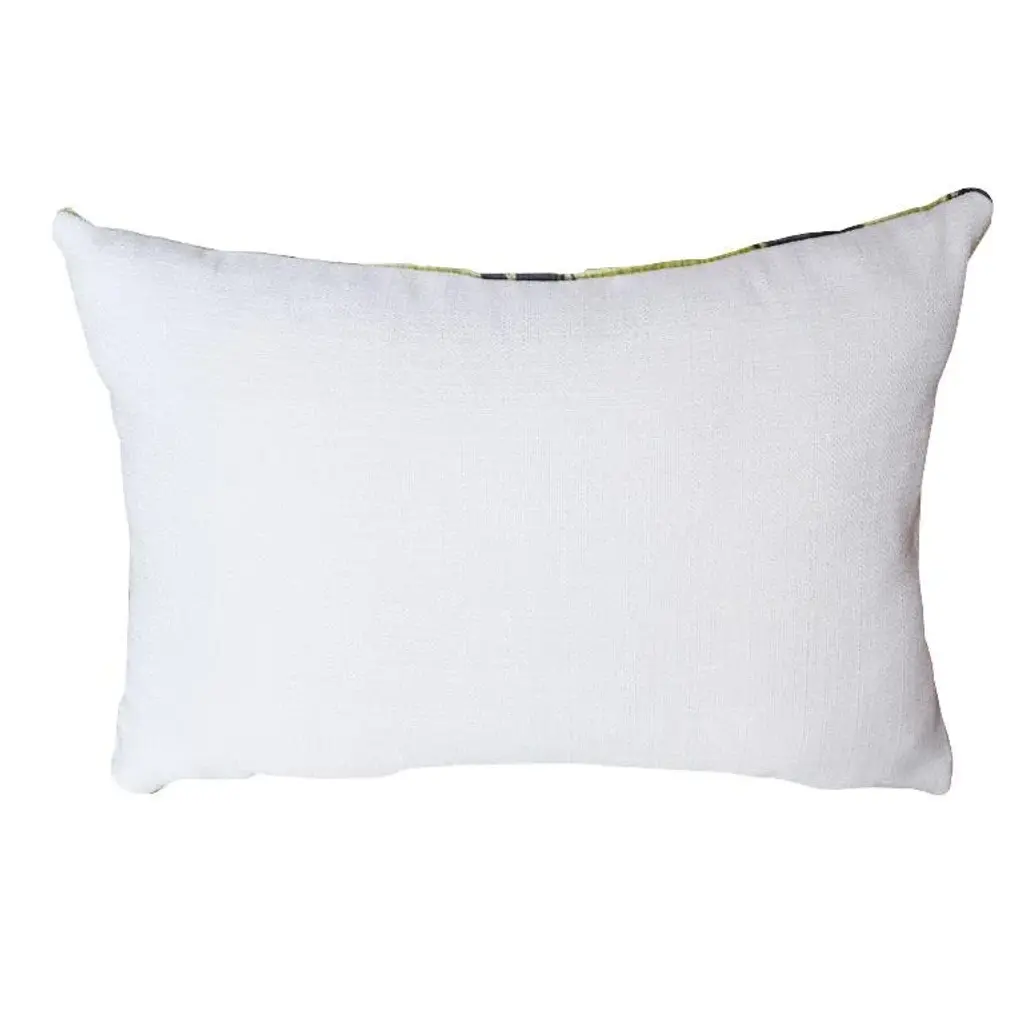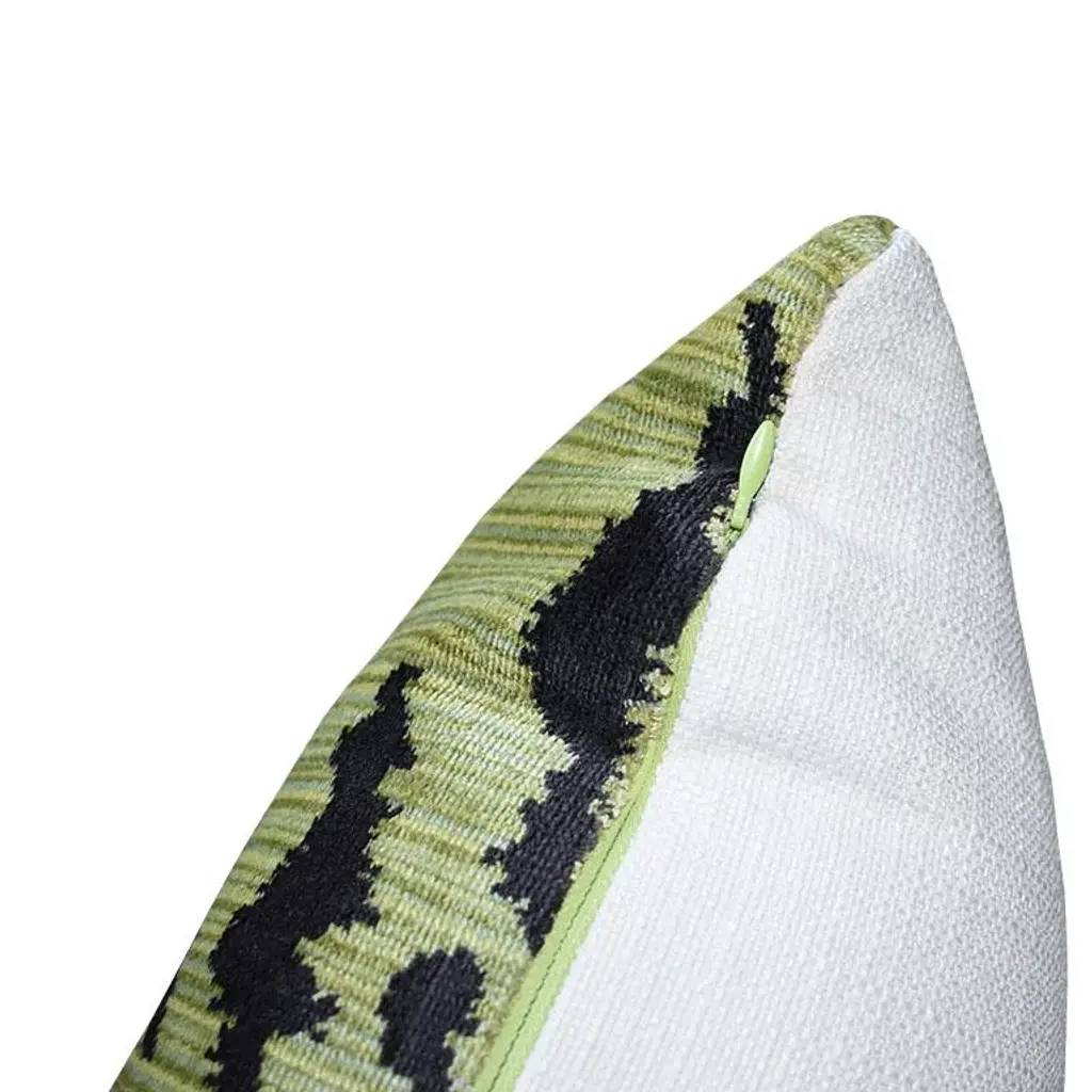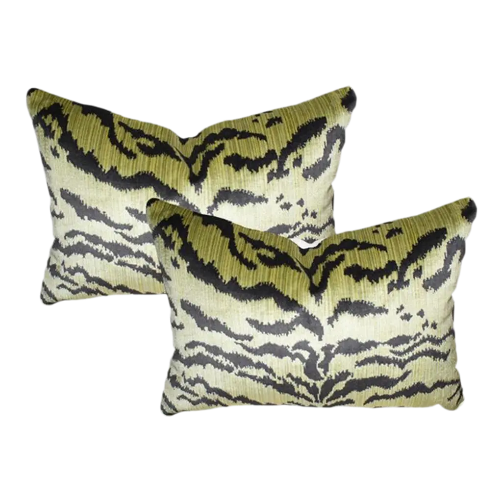 Animal motif tiger print lumbar pillow. Multiple available. The front features a gorgeous thick velvet animal print in green and black. The back features crisp white linen. Down-filled. Knife edge with zipper at the bottom. Fabric is after Scalamandre and originates in Belgium.