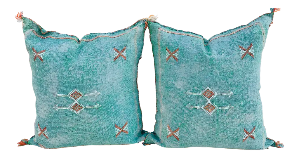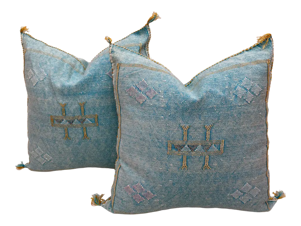 This gorgeous pillow is entirely hand-woven from silk that comes from a Sabra cactus plant. Every pillow is beautifully embroidered with a unique tribal motif that varies from every other pillow. Each pillow is dyed using vegetable dye using a special hand dying technique that gives each one their own lovely faded and beautifully aged colors. This pillow has a zipper closure, down blend insert is included