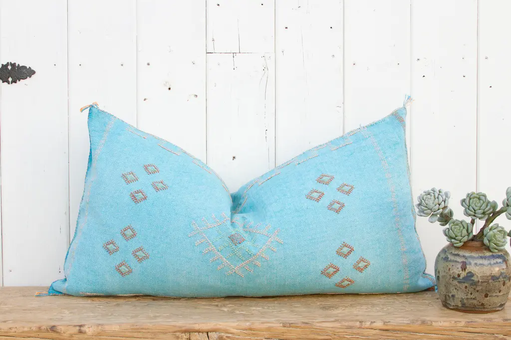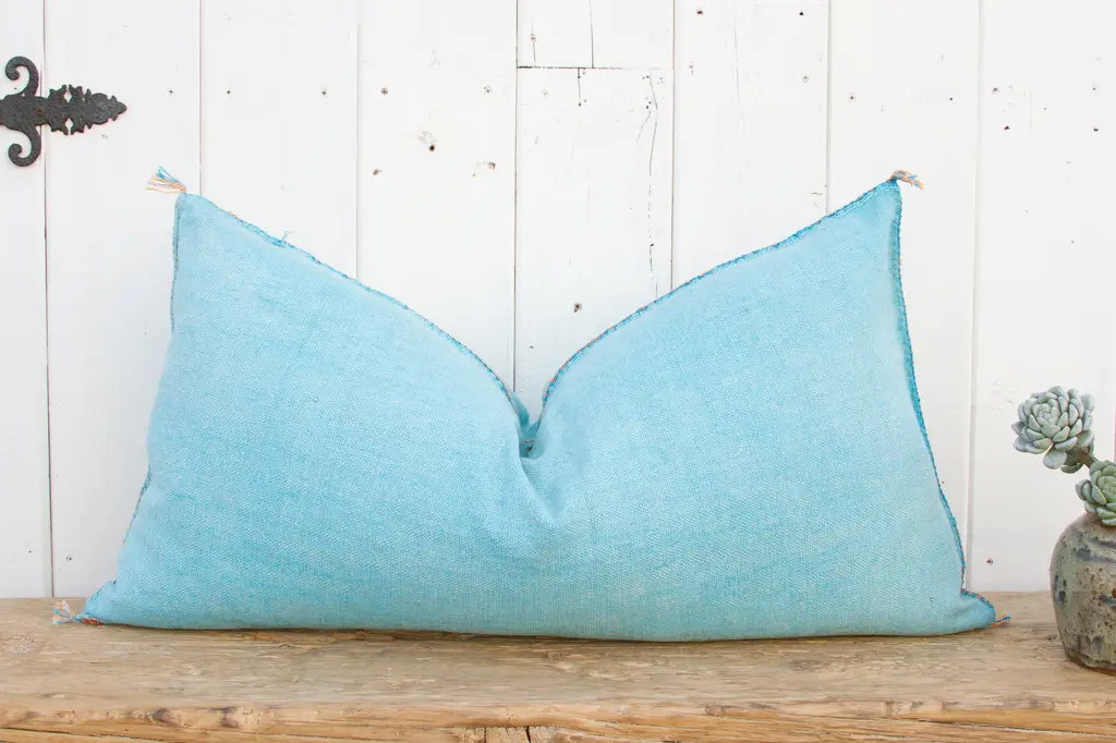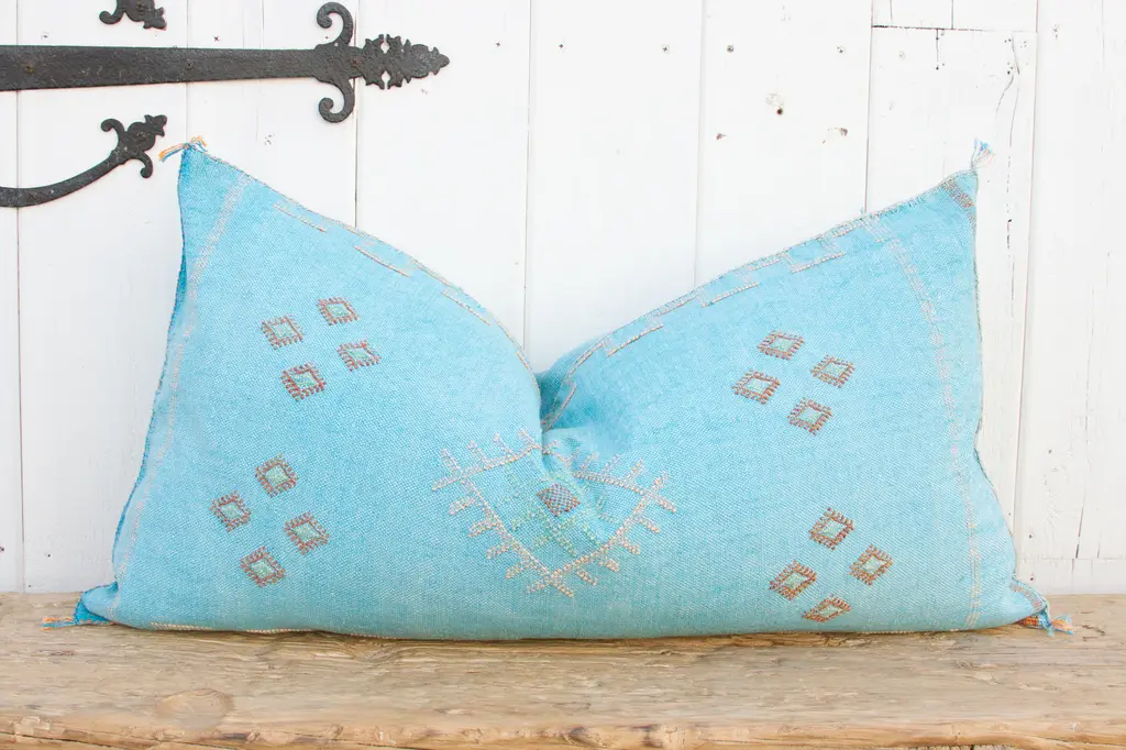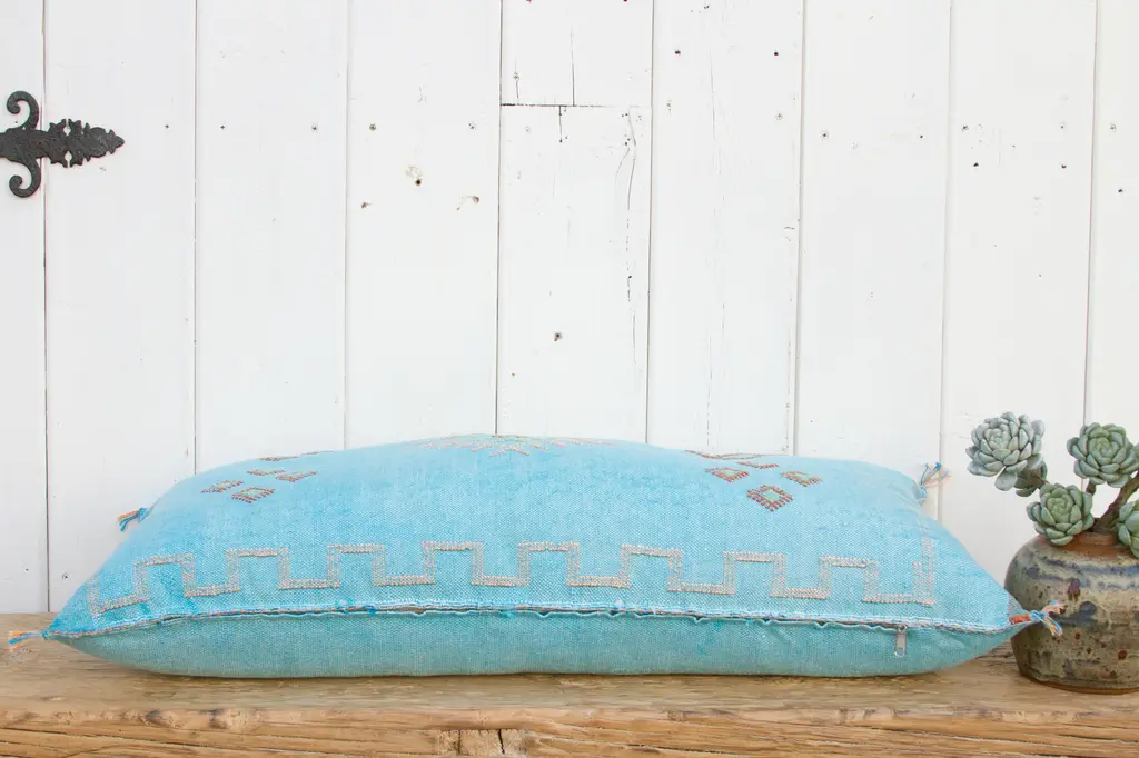 Aqua Lumbar Moroccan Silk Rug Pillow