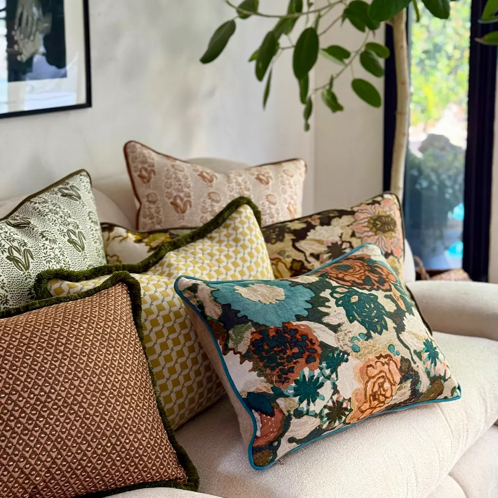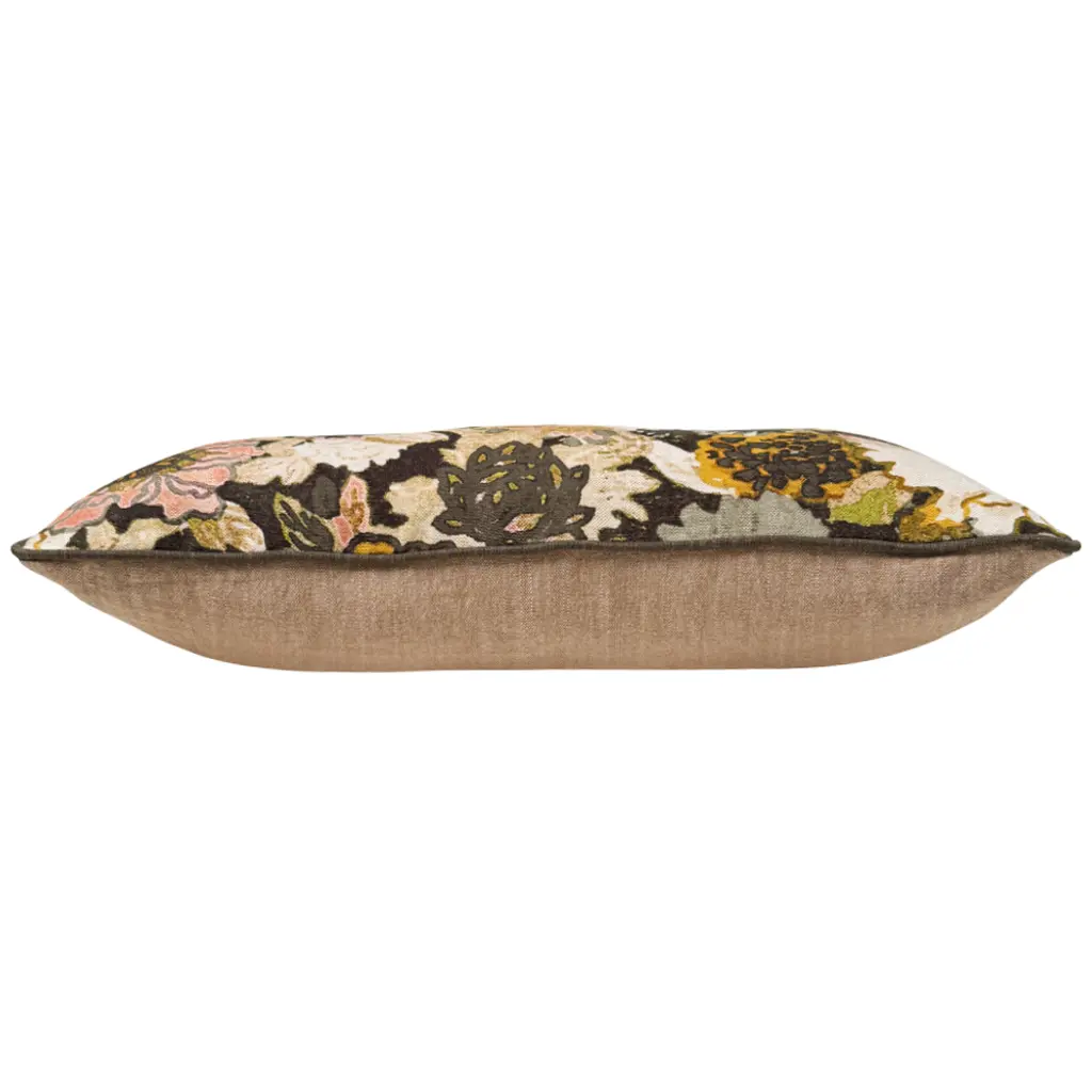 An abstract floral print pops in vintage yellows and pinks, making it a stunning accent for any sofa or bed. It includes a feather down insert and features a contrast welt with a solid linen back. Zipper closure ensures easy maintenance.