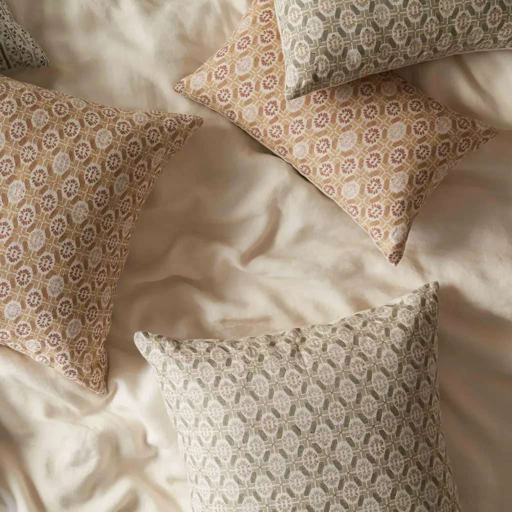 This pillow comes ready to style with a down alternative insert. The season is in full bloom. Bring the outdoors in with this beautiful lumbar pillow, inspired by the thriving gardens of India. Available in rich shades of sage and turmeric, each block-printed linen pillow is perfect for layering. Style as a statement piece for your guest bedroom or spruce up a reading nook with this stunning pillow. Crafted by master artisans in Jaipur, India, the design for every pillow is carved into wooden blocks by hand, before being pressed onto crisp, locally-sourced linen. All made start to finish in a fair trade working environment. This pillow comes ready to style. Cruelty-free down alternative insert included.