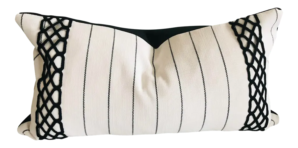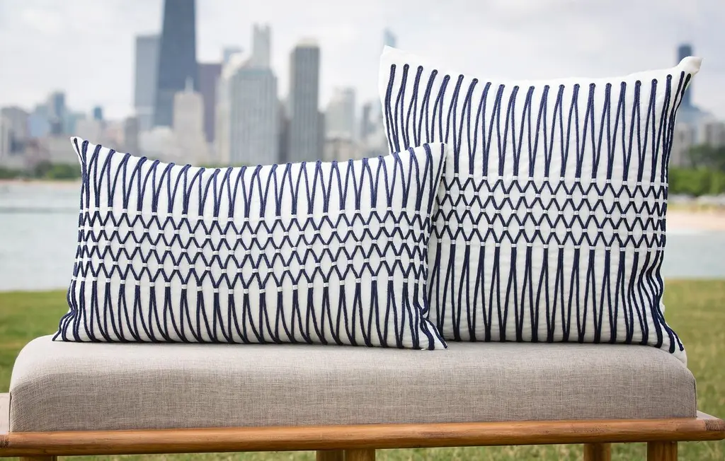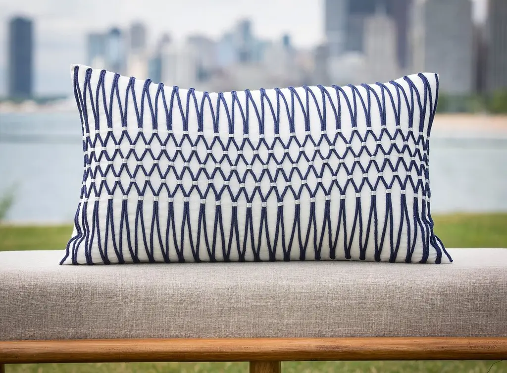 A stylish accent for any sofa, bed, or chair, this natural linen pillow is embellished with navy cording in a classic woven design and accented with silver metallic thread. Solid back. Insert included. Hidden zipper closure.