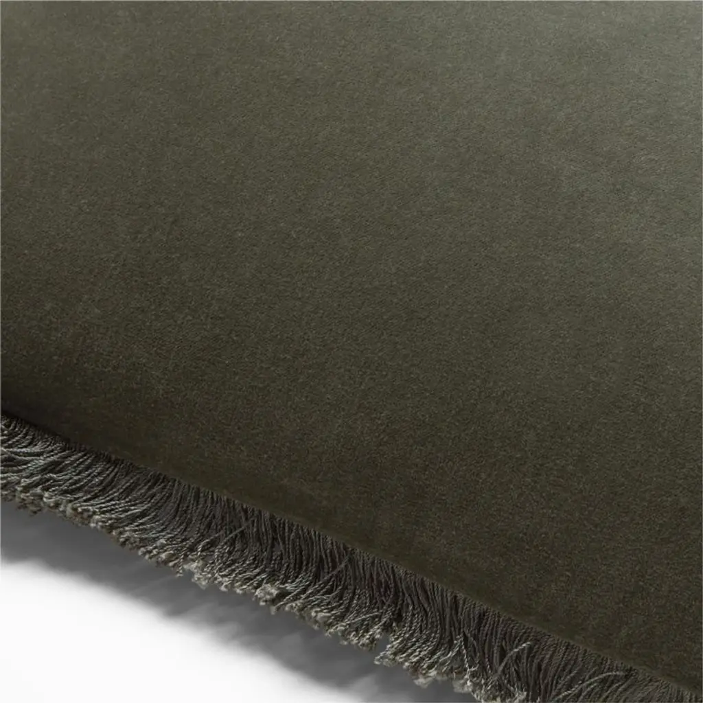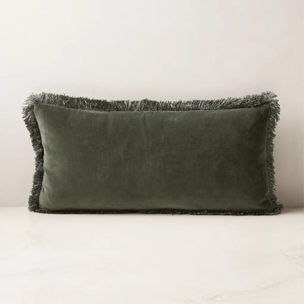 Rich tonal color is the secret to this seriously luxe throw pillow. Forest green velvet is edged in a fringe of slightly darker green for a look that's polished and pulled together. CB2 pillows include a pillow insert in your choice of feather down or down alternative. CB2 exclusive.