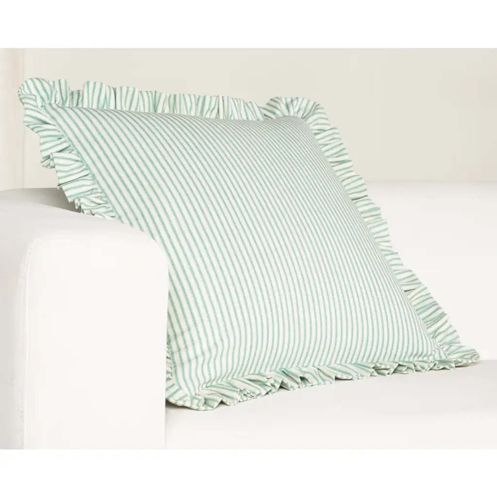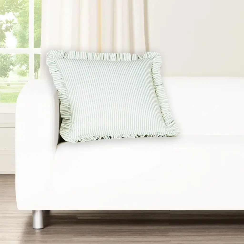 Add a touch of rustic charm and timeless elegance to your home with the Birch Lane Ticking Stripe Ruffled Accent Pillow from Siscovers, a captivating decorative pillow that enhances any living space. Measuring 20" x 20", this throw pillow is perfectly sized to complement sofas, chairs, or beds, serving as a stylish lumbar pillow or cozy bedroom pillow for both comfort and design. Crafted from pre-washed 100% cotton fabric, this accent pillow offers a soft, breathable, and durable construction that ensures long-lasting quality. The Ticking Stripe design features a classic narrow vertical striped pattern, as shown in the uploaded image, available in six versatile color options: Aqua (bright blue and white), Black (deep black and white), Driftwood (warm beige and black), Lake (soft gray-blue and white), Navy (rich blue and white), and Ocean (deep teal and white). The understated, evenly spaced stripes evoke a nostalgic, farmhouse aesthetic, while the charming 2" ruffle trim adds a whimsical, ruffled accent that complements coastal, traditional, or shabby chic interiors. Designed for practicality, the pillow includes a removable cover with a discreet zipper closure, making it easy to clean and maintain. Choose between two premium fill options—plush polyester fiber or luxurious feather fill—to customize your comfort. Both fills ensure the pillow retains its shape and provides ample support, making it an ideal decorative throw pillow for lounging or as a living room cushion for added flair. Care is simple with this machine-washable pillow cover, allowing you to keep your accent pillow looking fresh and vibrant with minimal effort. Remove the cover, toss it in the washing machine, and restore its pristine condition—perfect for busy households or pet-friendly spaces. Proudly made in the USA from start to finish, this ruffled accent pillow reflects exceptional craftsmanship and attention to detail, ensuring top-quality standards. Whether you’re updating your patio seating, refreshing your bedroom pillows, or adding a pop of pattern to your décor, the Birch Lane Ticking Stripe Ruffled Accent Pillow combines functionality with classic style. Key Features: Size: 20" x 20" Material: Pre-washed 100% cotton fabric Design: Ticking narrow vertical striped pattern with a 2" ruffle trim, available in Aqua (blue/white), Black (black/white), Driftwood (beige/black), Lake (gray-blue/white), Navy (blue/white), and Ocean (teal/white) Fill Options: Polyester fiber or feather Closure: Zipper closure for removable cover Care: Machine-washable cover Origin: Made in the USA Bring a touch of vintage elegance and cozy comfort to your home with this must-have decorative pillow. Perfect as a throw pillow, lumbar pillow, or accent cushion, the Birch Lane Ticking Stripe Ruffled Accent Pillow from Siscovers is designed to complement your interior design with charm and durability. Order yours today in your preferred color and fill option!