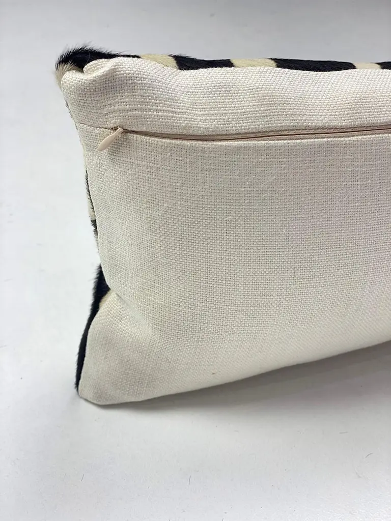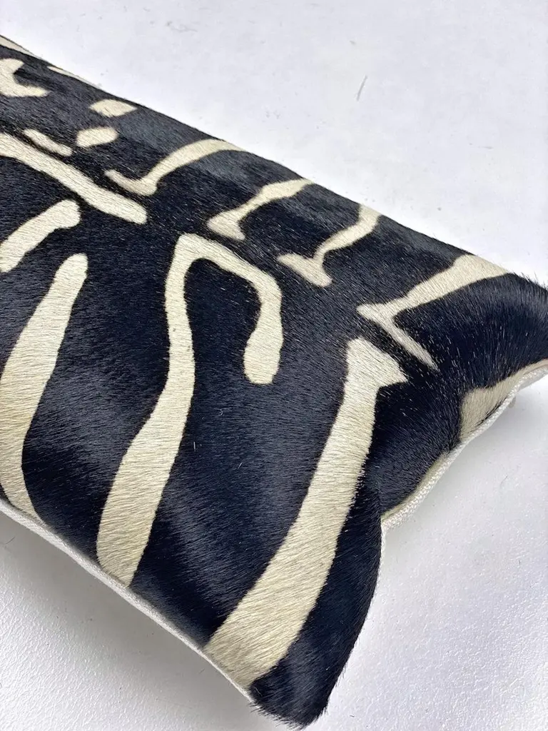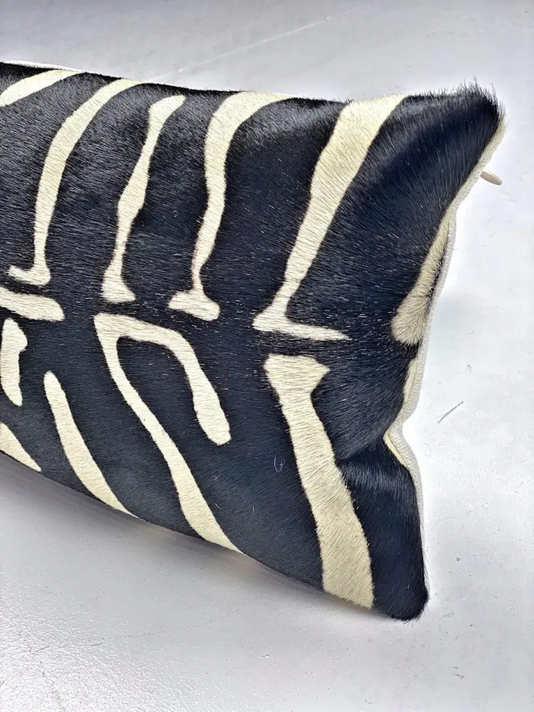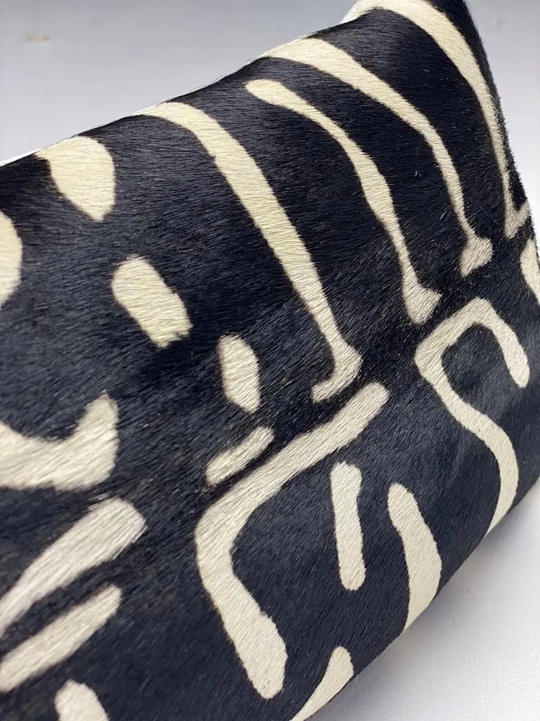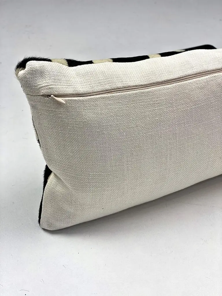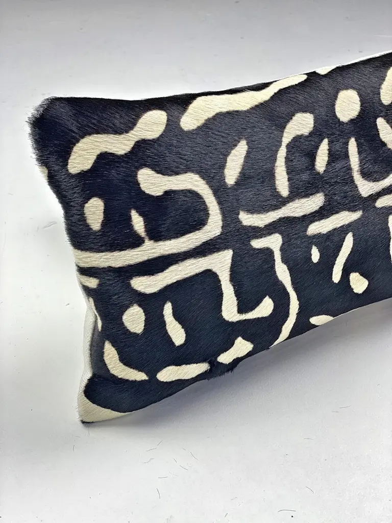 A striking black and white lumbar pillow enhances the contemporary mood of an interior. The slender rectangle pillow is hand-crafted using hair-on cowhide with a screen-printed, tribal abstract design. The black abstract design is printed onto a natural white cowhide with soft creamy undertones.This eclectic tribal abstract pillow expresses the beauty of natural and sustainable design providing an exotic element to an accent chair or bed. A limited edition, with only four available, the pillow comes fitted with a feather insert and is completed with a European linen reverse.Features:Col: Black and natural whiteCowhide pillow with hair onDimension: 25x55cmLimited EditionSingle-sided cowhide frontPure Linen reverseMade in AustraliaFeather cushion insert includedProduct care:Spot clean only with clean lukewarm water and gentle wool wash detergent. Do not submerge into water or wash. Do not apply chemical agents Professional Dry clean only.Natural product:This pillow is a natural product therefore variation in color tones and print may vary and are all classed as natural characteristics of animal skin products.