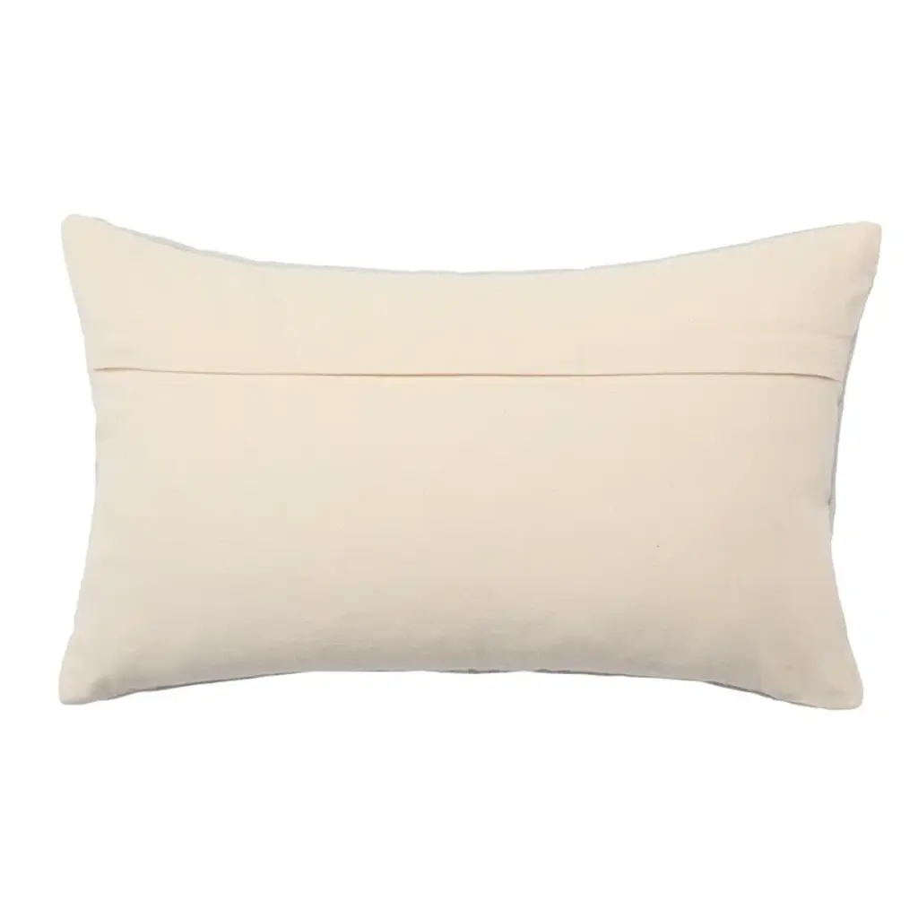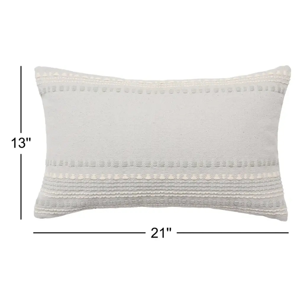 This modern lumbar pillow features intricate, light gray and cream embroidery in a geometric striped pattern on a light gray base. The lightweight 100% cotton material provides a relaxed and inviting feel in any contemporary home.