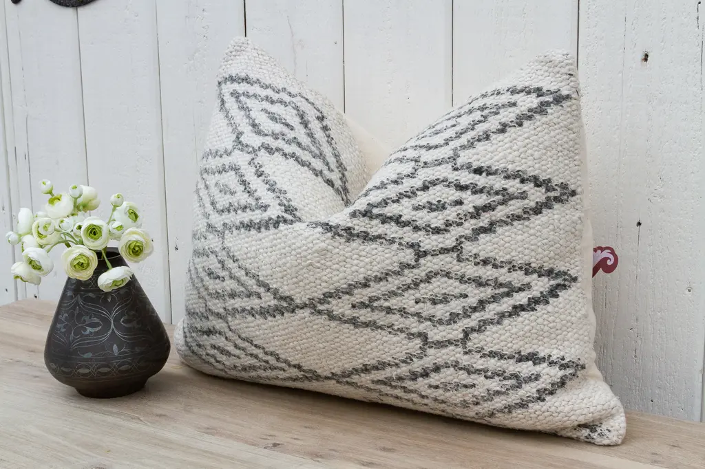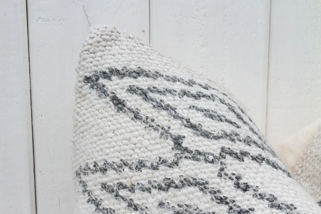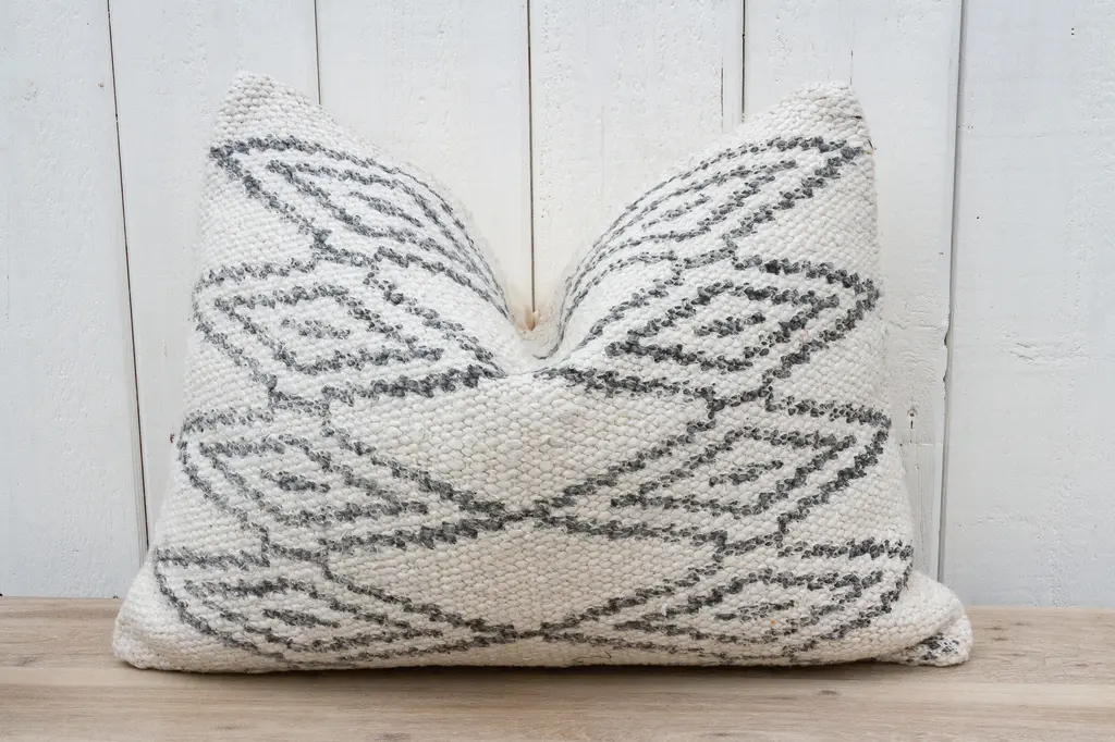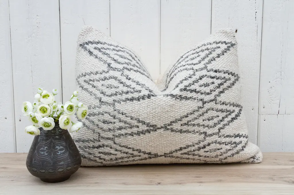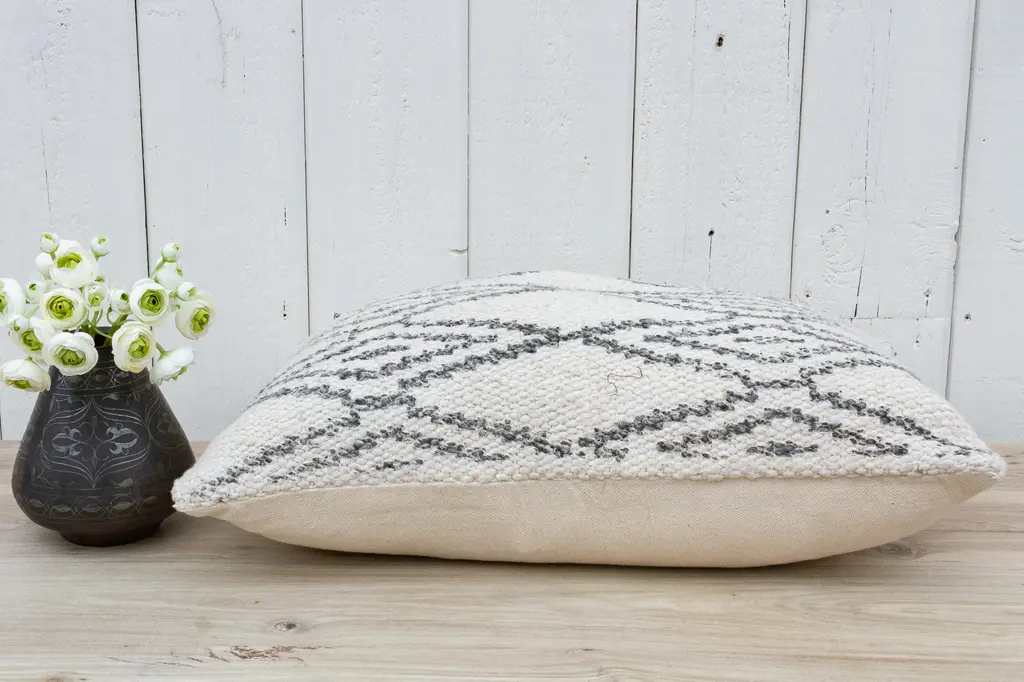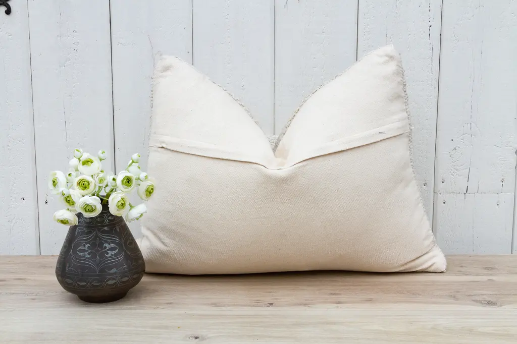 A tribal Beni Ourain cotton lumbar pillow. This Moroccan pillow shows patterns and designs traditional to tribes of the Atlas Mountains. Featuring tribal motifs with fun embroidery this bohemian pillows adds a warm and inviting touch to any decor. Pillow insert included.