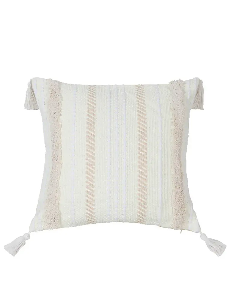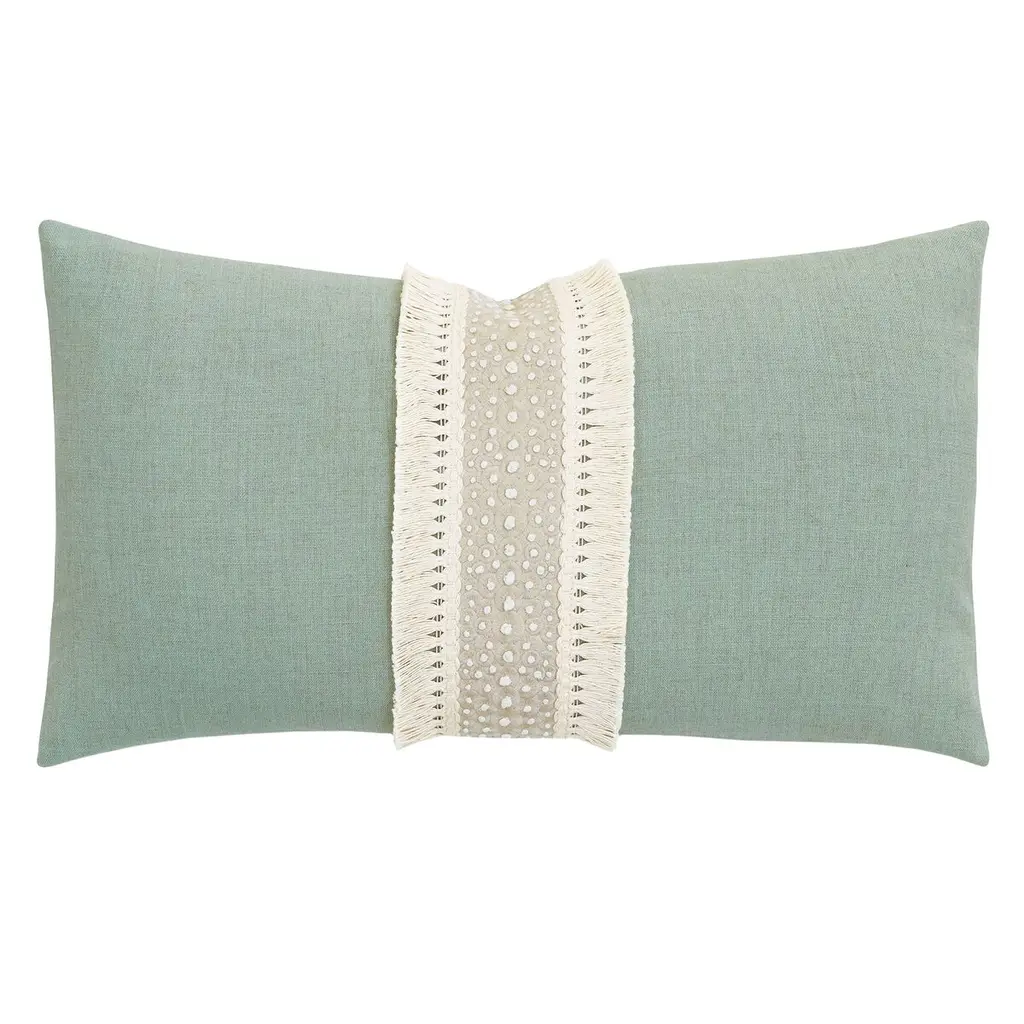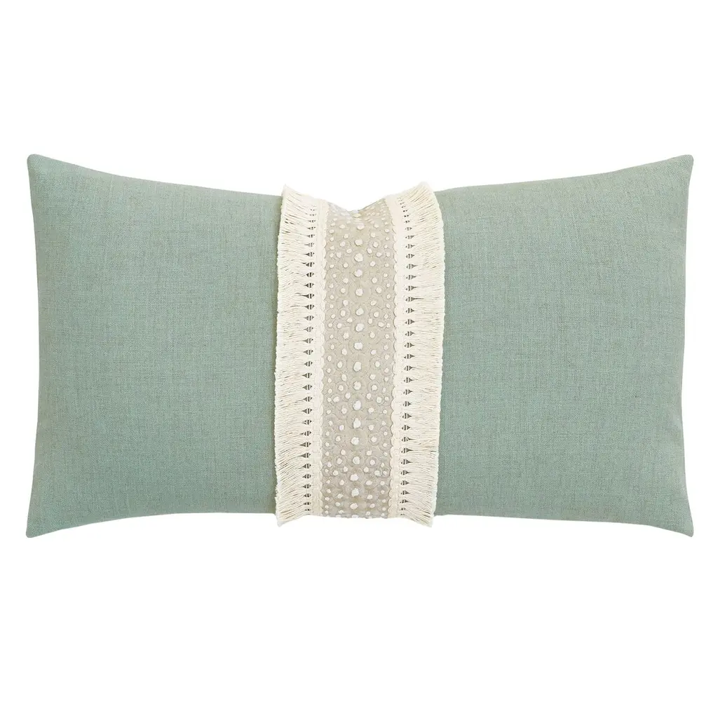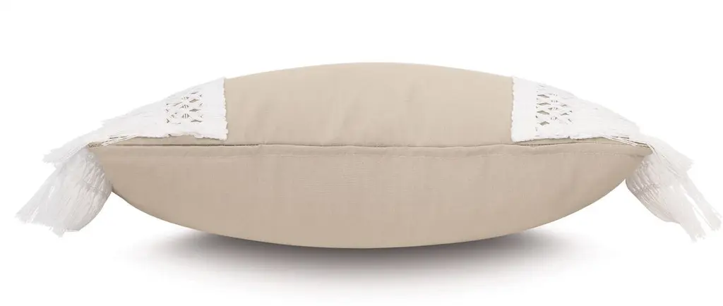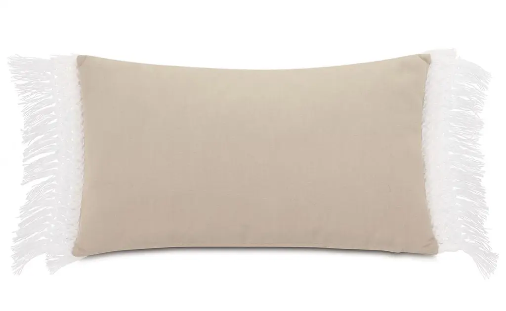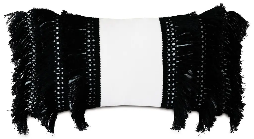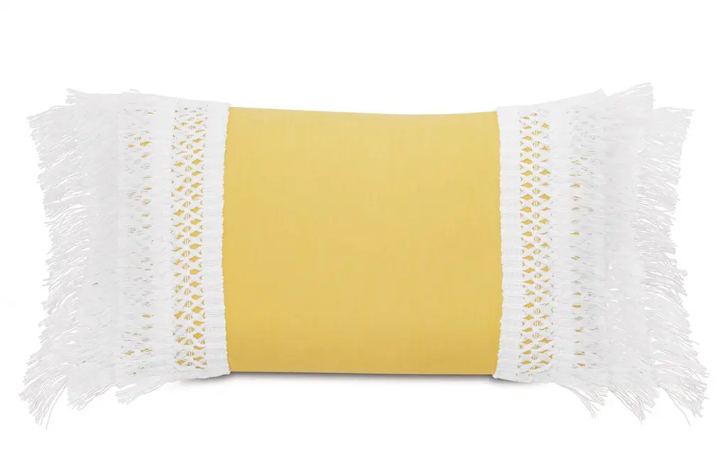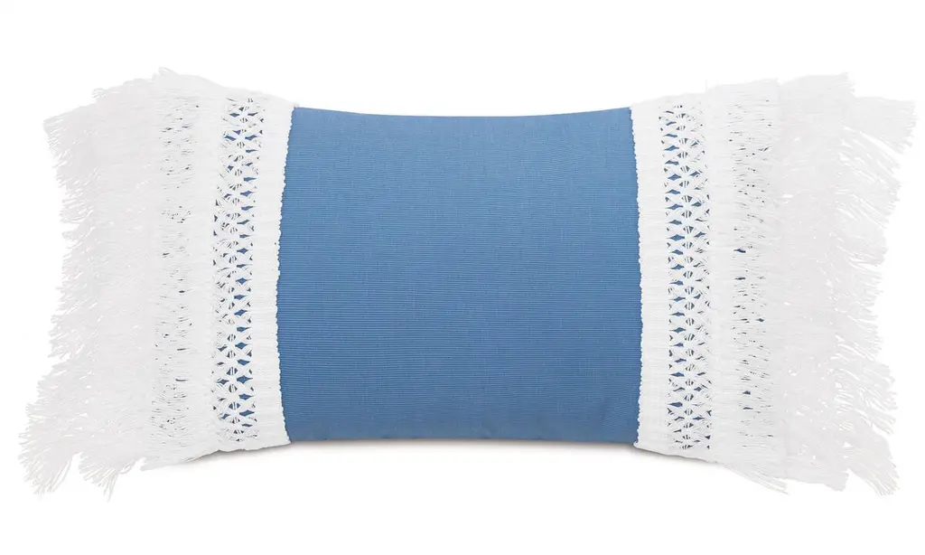 Rows of macramé fringe add flirty flair to the front of this lumbar pillow. Made in the USA of easy-to-clean fabric that resists fading, soil, and mildew, the pillow will maintain its good looks for seasons to come. Solid back. Hidden zipper closure.
