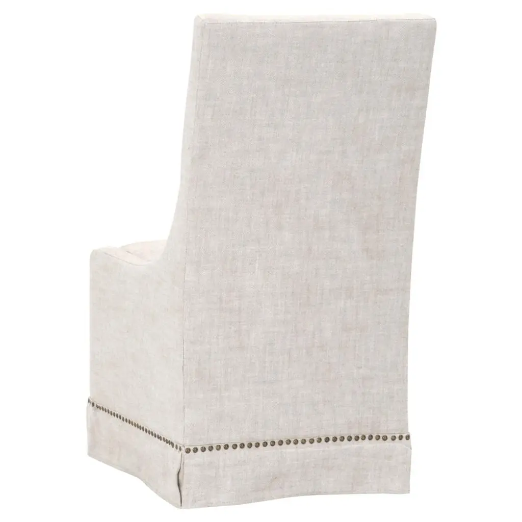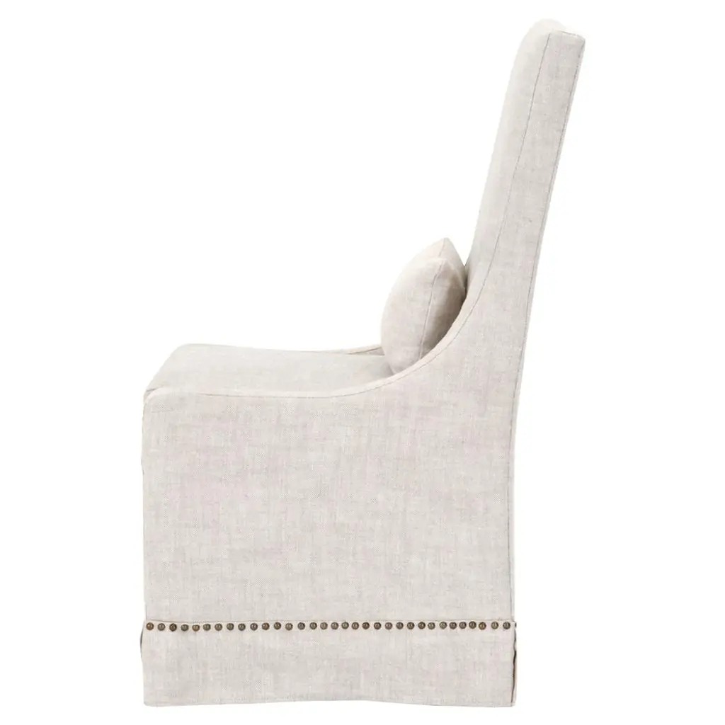 Add effortless elegance to the interior design of your dining room with our set of Candice Modern Beige Upholstered Birch Gold Trim Dining Side Chair. This designer dining side chair features chic nailhead trim and is beautifully upholstered in beige linen. Crafted from solid birch wood and fabric, this chair also includes a lumbar pillow.