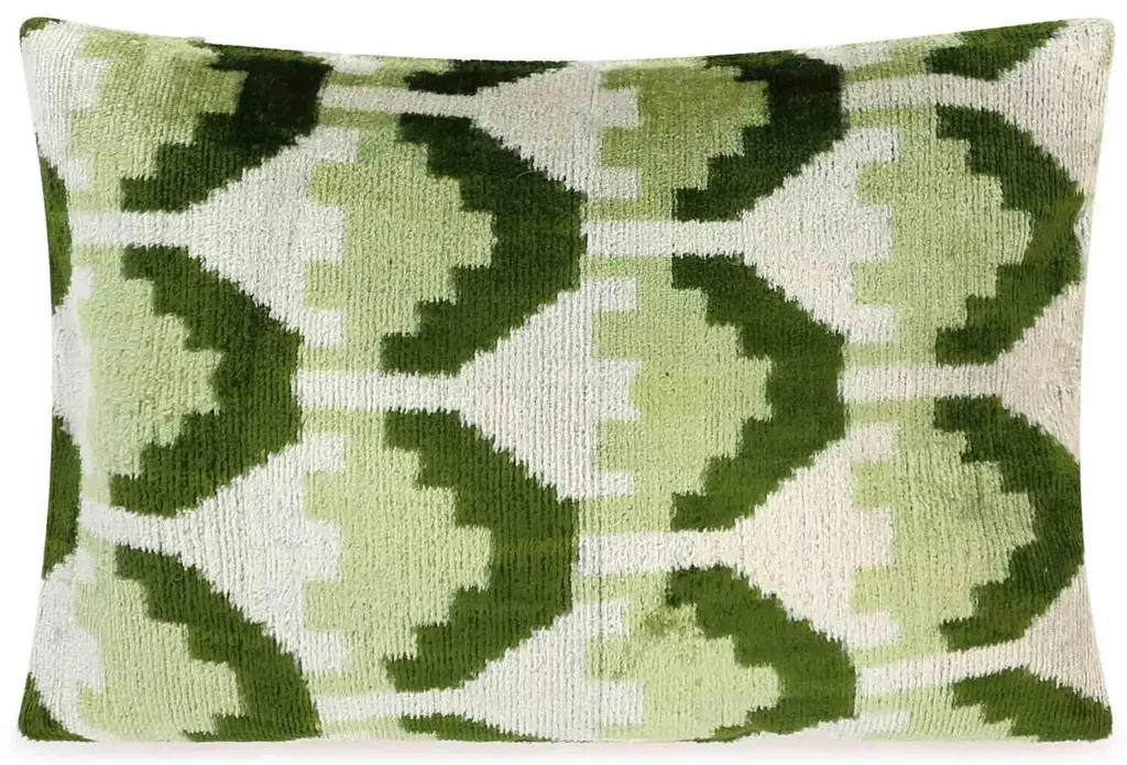 Canvello Handmade Velvet Lumbar Pillow In Green And Cream Ikat Design