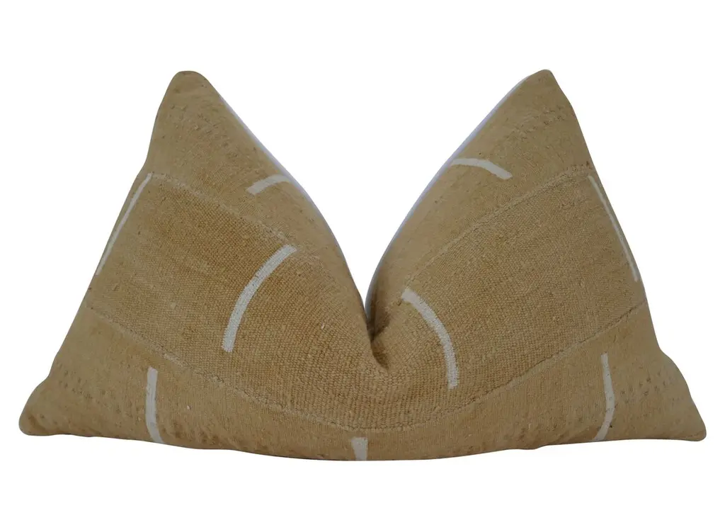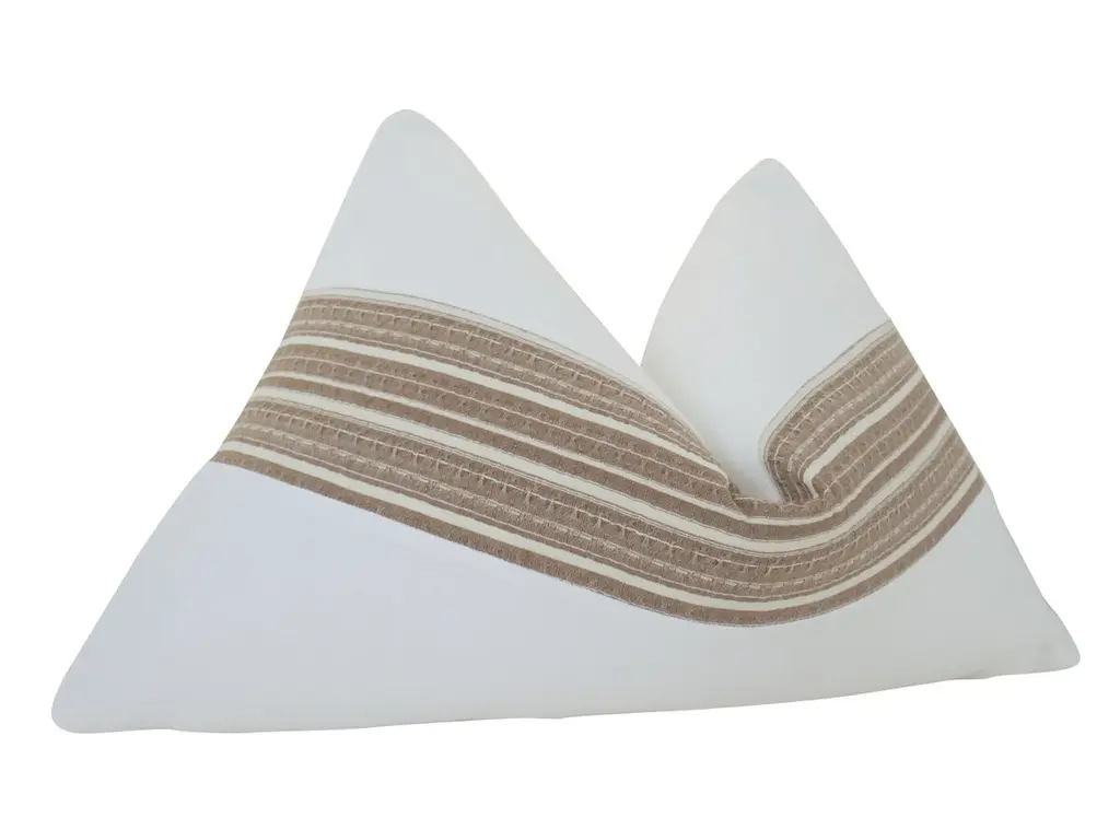 Exclusive to One Kings Lane: Cut and sewn by hand in California, this lumbar pillow has patterned tan stripes across the front that give it artisanal flair. The ultra-Plump feather-and-down insert, with an invisible zipper closure. Solid white, premium luxe 100% linen reverse side.