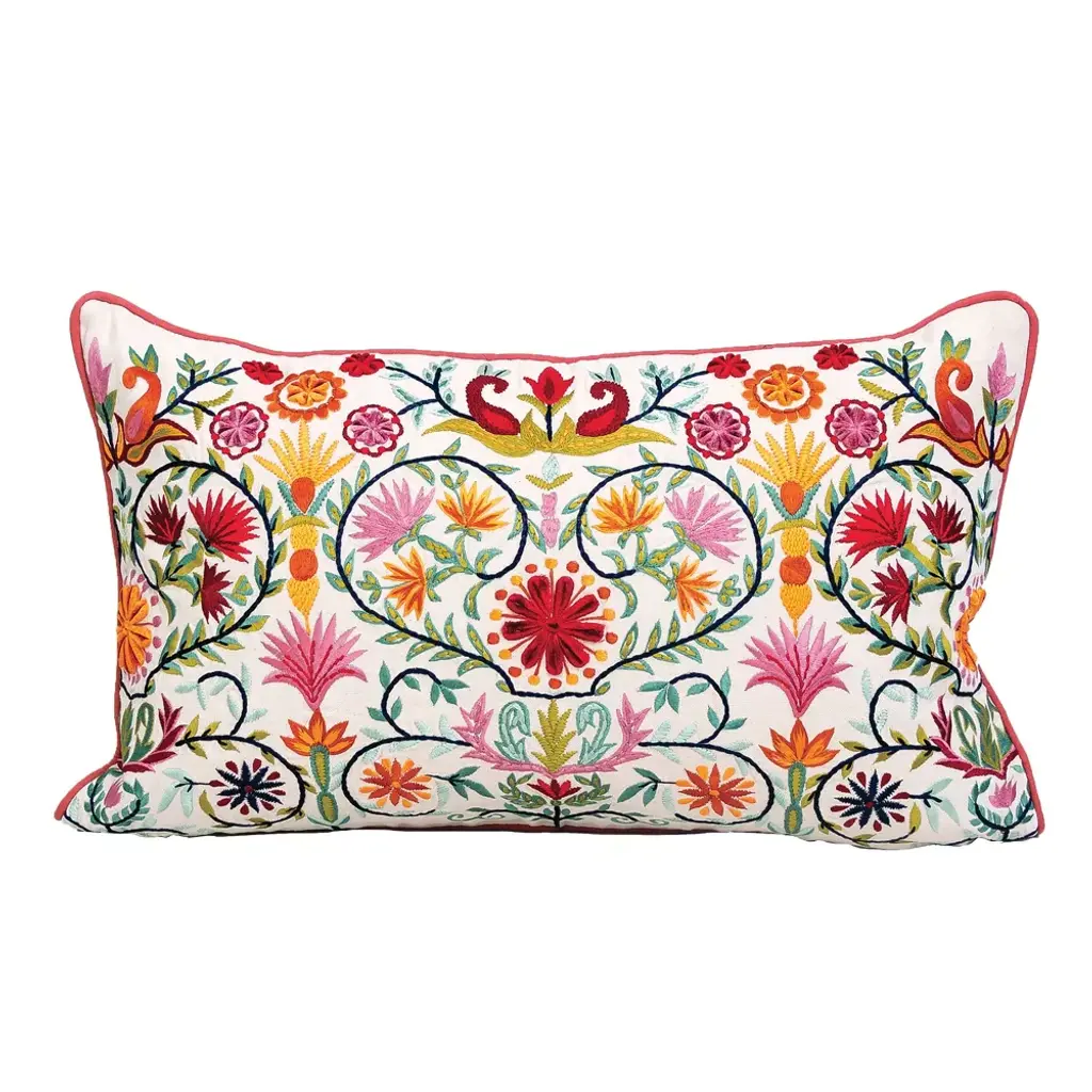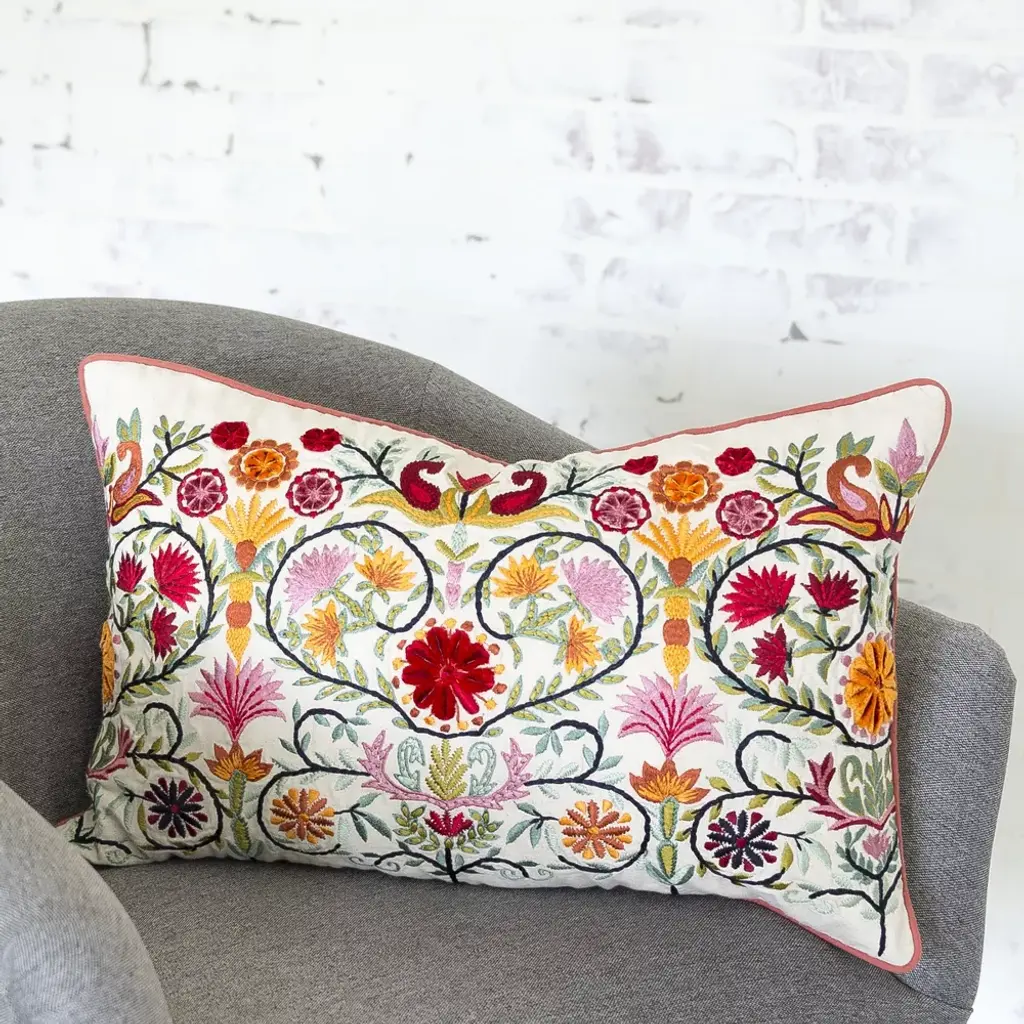 Color your world with the deco floral embroidery of the Pippa 100% Cotton Lumbar Pillow from carol & frank. Crafted of cut velvet, and finished with a piped edge, this pillow features a hand embroidered symmetrical floral design in a vibrant color palette to liven up any room. Style it with any carol & frank bedding for an insta-chic look.