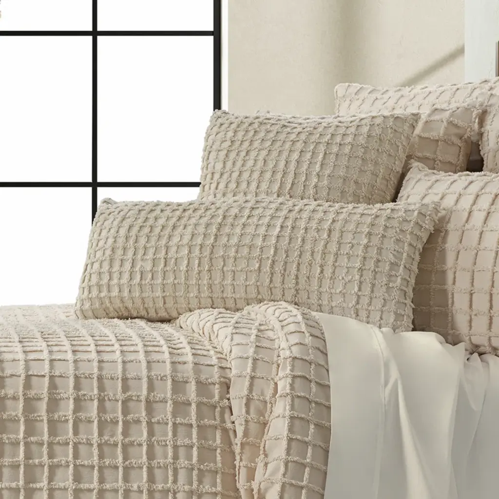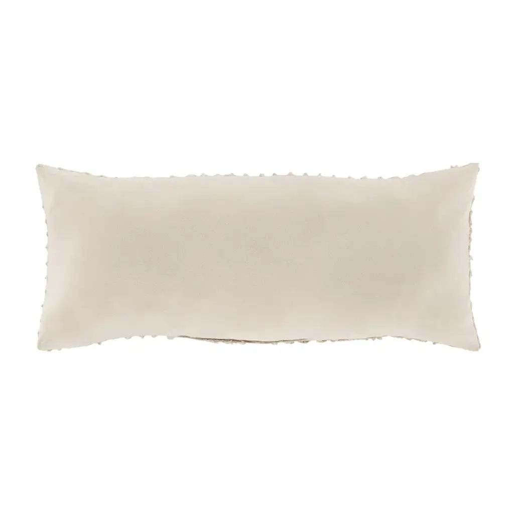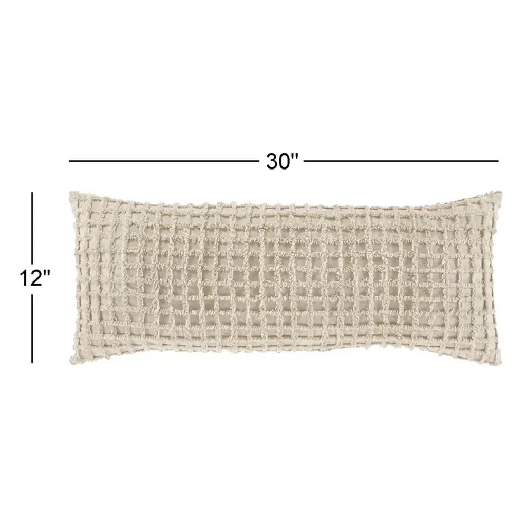 The lumbar pillow is constructed in soft cotton that features a candlewick tufting technique, which offers a raised small grid pattern for a plush and cozy texture.