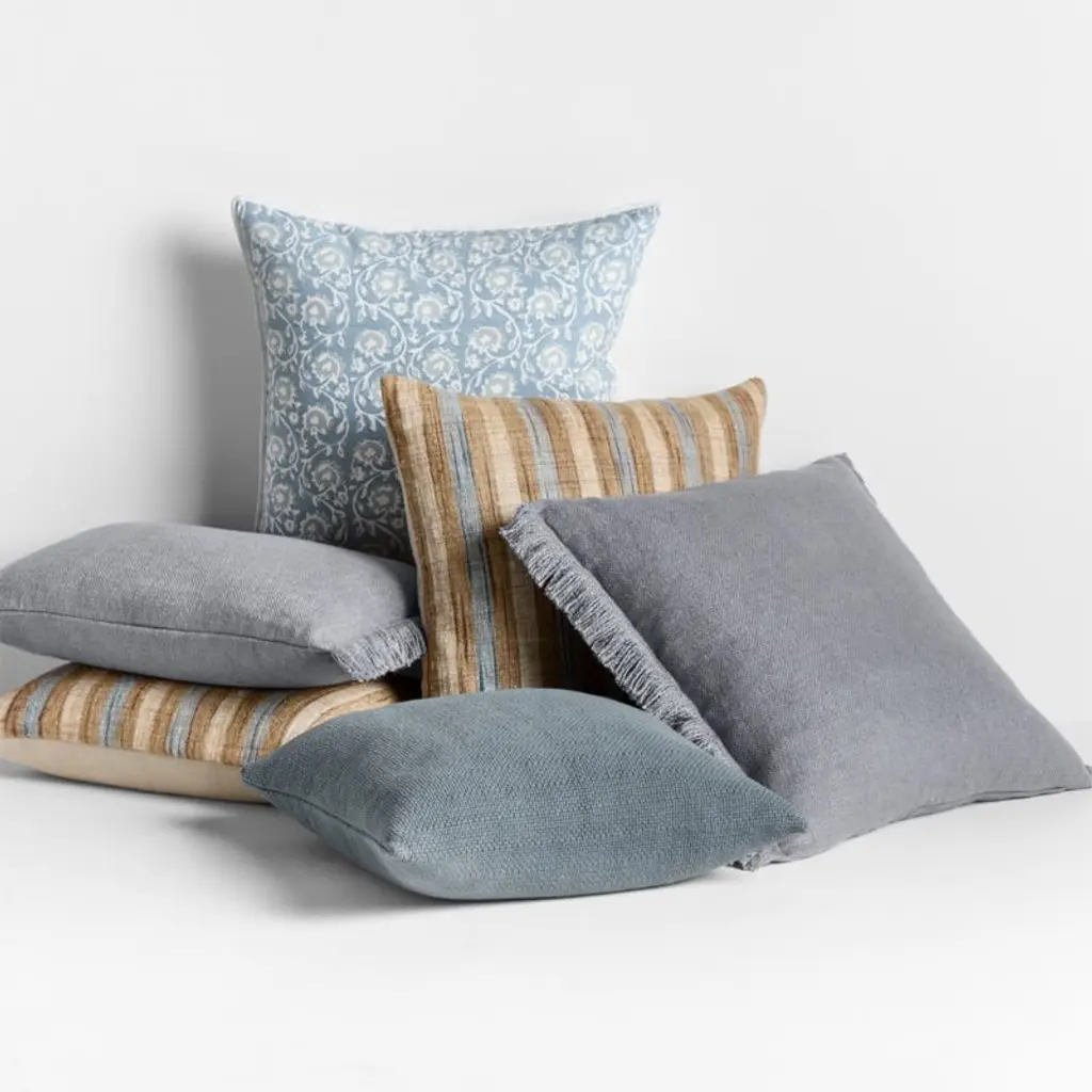An irresistibly soft and slubby weave gives this throw pillow a relaxed look and feel that you'll want to snuggle up with every day. The inclusion of silky viscose adds a sophisticated sheen to the organic beauty of sustainably sourced linen fibers. Yarn-dyed smoky blue, the fringed pillow looks chic and casual tossed on a sofa, armchair or bed-especially paired with the matching throw blanket. Our lumbar pillow includes your choice of a plush feather-down or lofty down-alternative insert.