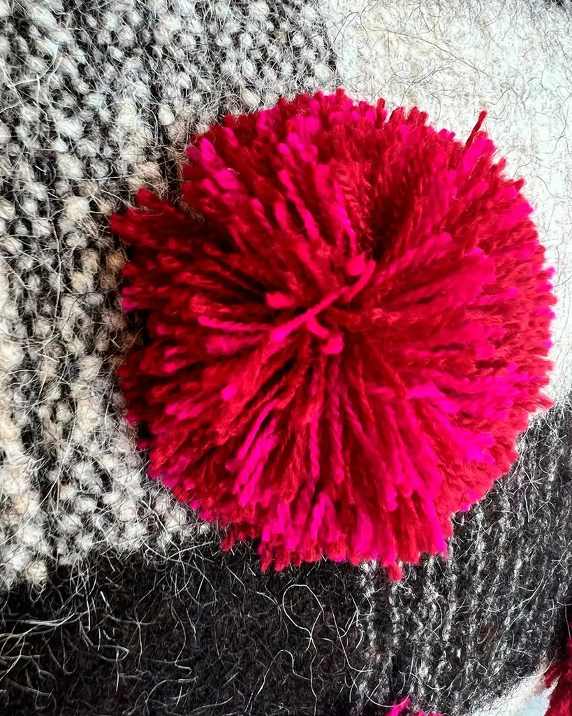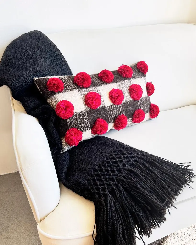 Chamula Gray White & Black Checkered Red Pom Pom Throw Pillow Handmade 100% Wool