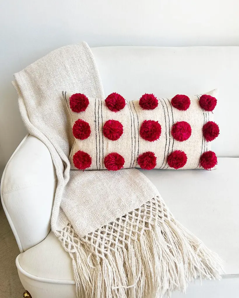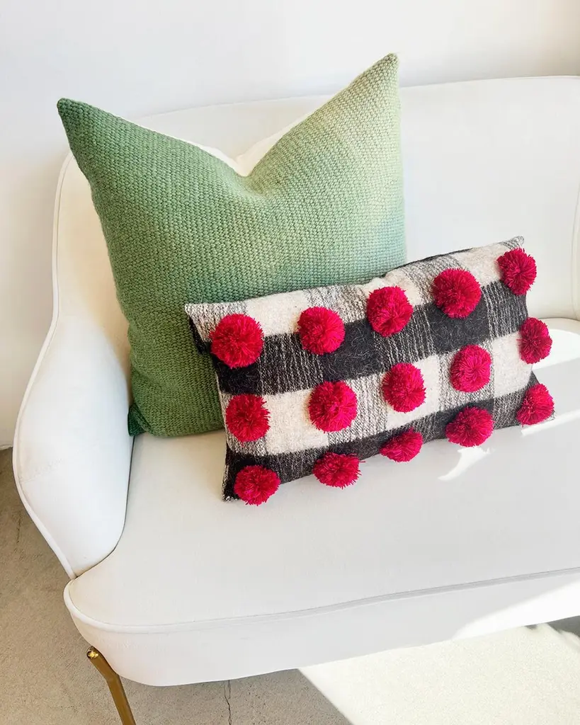 Add some subtle and elegant holiday vides to your home decorThis lumbar pillow from Chamula blends rustic charm with subtle holiday cheer. Crafted from wool, it features a black and white striped base with red pompom accents, ideal for seasonal decorating and interior design. Perfect for fall and winter, this pillow adds a cozy touch to any home.Size, color and background pattern can vary a bit due to the fact that they are individually handmade. Up in the mountains of Chamula in Chiapas, Mexico - an area not accessible by car - the artisans who create these beautiful wool pillows live and work with their sheep. The sheep are considered sacred in their culture and are treated with the utmost care. The wool is harvested, spun, and then woven on traditional backstrap looms all within the same community of artisans. Size: 12"x20"Made from 100% wool sheared from Chamula community sheep, considered sacred in local culture, and dotted with deep red pom poms hand dyed with natural cochineal. Insert: 10/90 Hypoallergenic Duck Down/Feather premium inserts.Care: Hand wash your pillow cover with cold water. Dry in a shaded area.