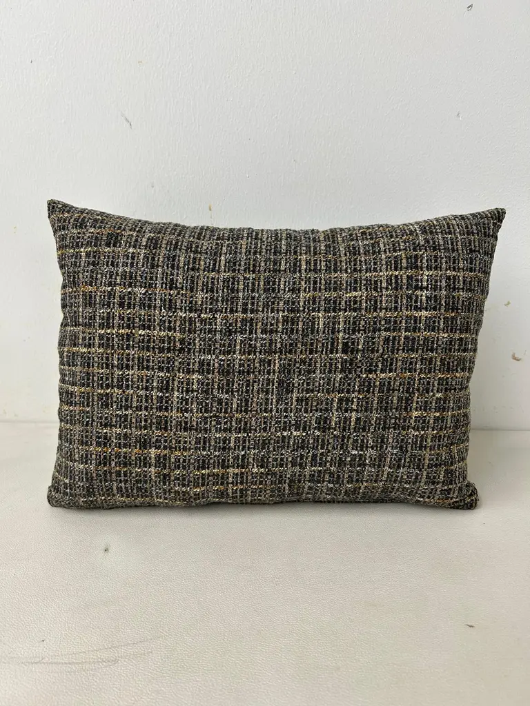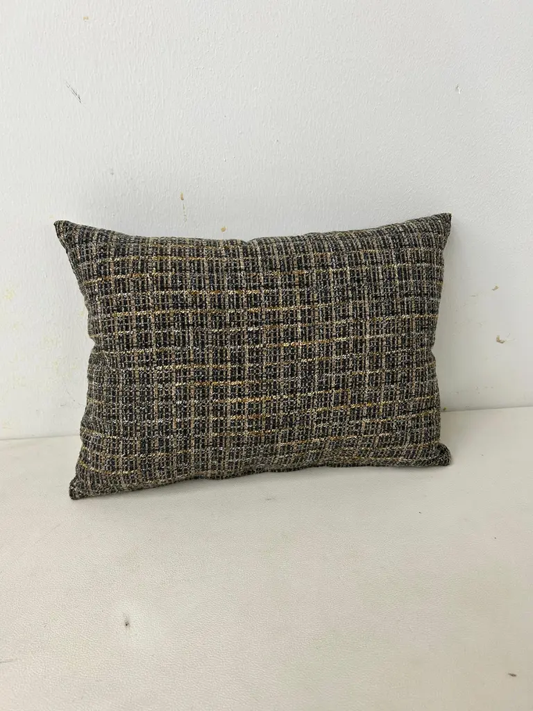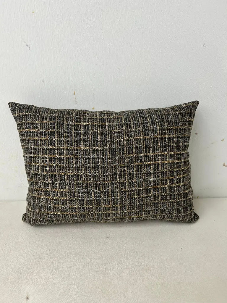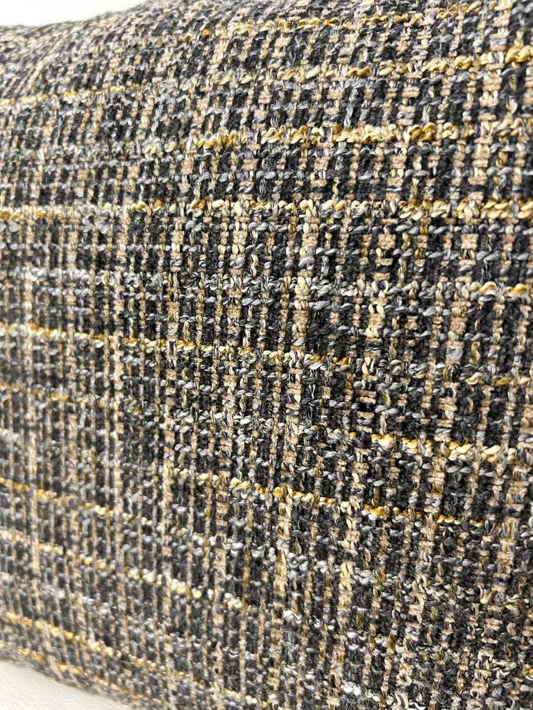 Classic Textured Lumbar Pillow-Black, Grey and Gold Grid Design.Dimensions:16"W11"H4"DAdd a touch of modern elegance to your home decor with this stylish lumbar pillow. The pillow features a unique interwoven grid design in black, grey and gold tones, creating a sophisticated textured look. Its shape provides excellent lumbar support, making it perfect for sofas, chairs or beds.Easy to pair with a variety of decor styles, while the luxurious texture adds depth and visual interest. Please note there are a total of (3) limited edition lumbar pillows available; lumbar pillows are sold separately.These are hand crafted by our upholstery shop in Medina, Ohio. Let us know if you have any questions regarding these lumbar pillows.Thank you.