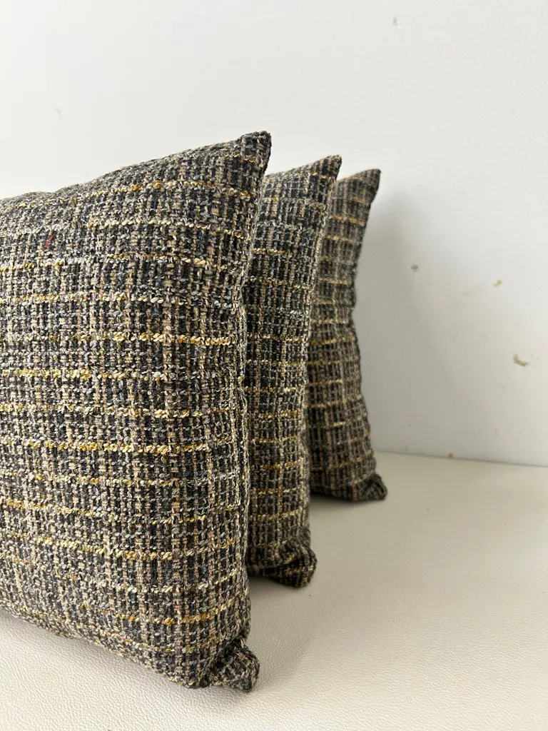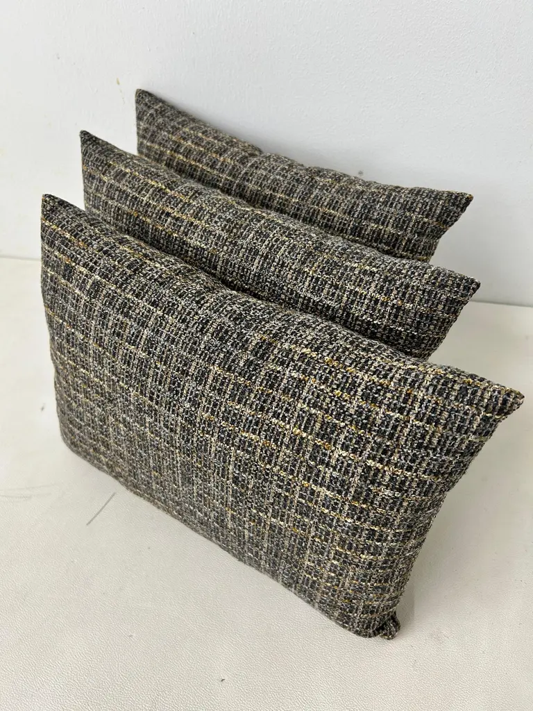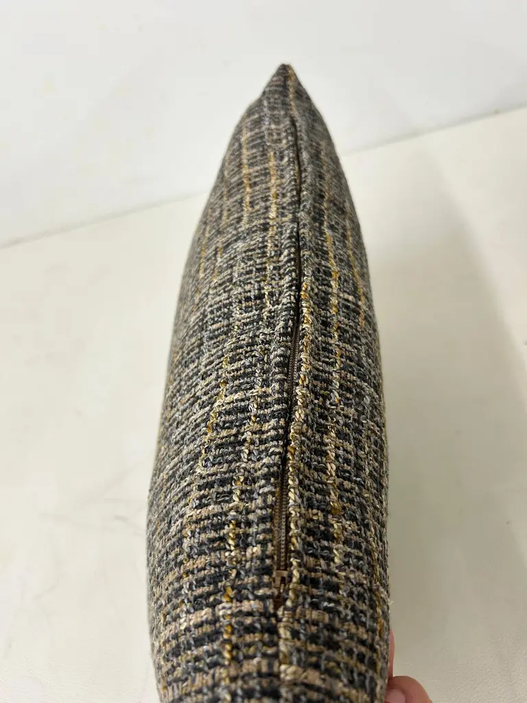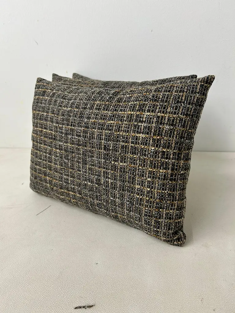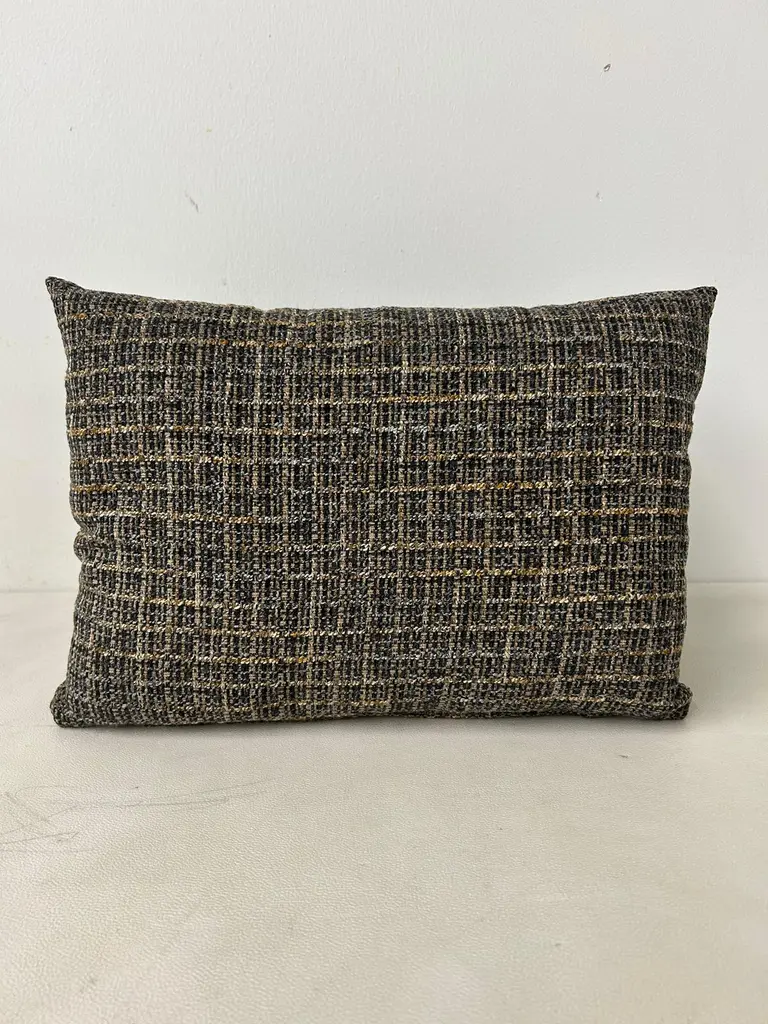 Classic Textured Lumbar Pillow-Black, Grey and Gold Grid Design.Dimensions:16"W11"H4"DAdd a touch of modern elegance to your home decor with this stylish lumbar pillow. The pillow features a unique interwoven grid design in black, grey and gold tones, creating a sophisticated textured look. Its shape provides excellent lumbar support, making it perfect for sofas, chairs or beds.Easy to pair with a variety of decor styles, while the luxurious texture adds depth and visual interest. Please note there are a total of (3) limited edition lumbar pillows available; lumbar pillows are sold separately.These are hand crafted by our upholstery shop in Medina, Ohio. Let us know if you have any questions regarding these lumbar pillows.Thank you.