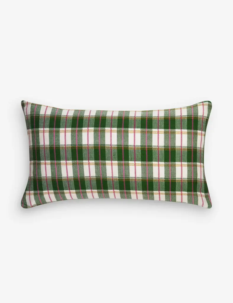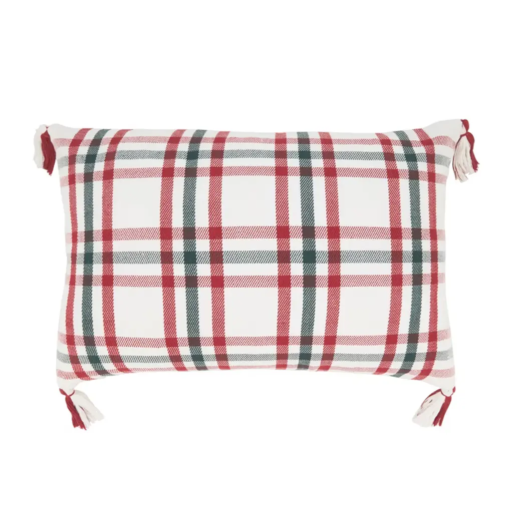 This cotton blend lumbar pillow features a classic embroidery in a natural, green, and red plaid pattern, evoking the warmth of holiday traditions. The cover, woven from a soft cotton blend, invites anyone to relax and enjoy the comfort it provides. With a chambray back for added style, this pillow is filled with the same quality cotton blend, ensuring a cozy feel and consistent shape. Its generous proportions make it a standout addition to any space, inviting the festive spirit of the season into the home. Whether it's nestled on a couch or adding charm to a bed, this lumbar pillow is a celebration of holiday comfort and style.Features: